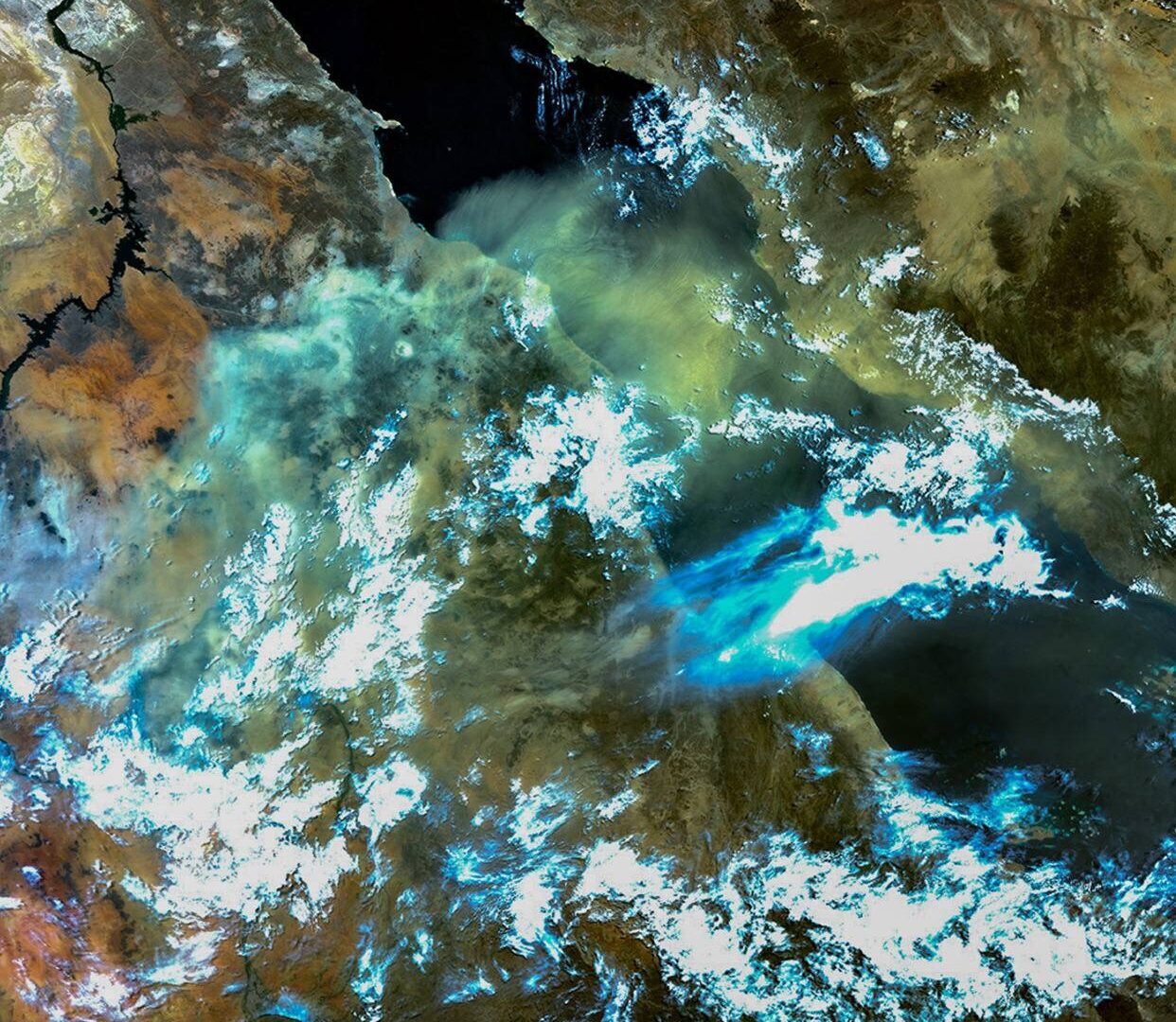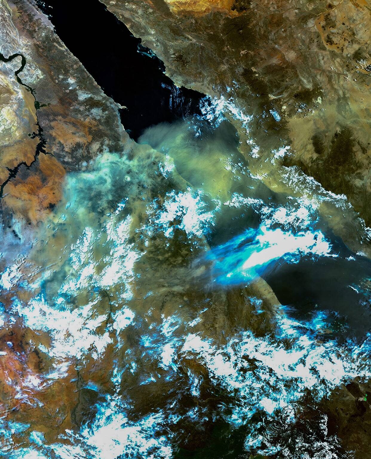 Satellite imagery reveals a fractured shoreline where irregular bays carve into sun-baked terrain of orange and brown. A vivid blue streak s…