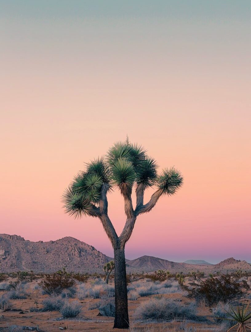 A Joshua tree stands centered in a desert landscape with a mountain range in the distance. Soft pink and blue hues blend in the sky, creating a gentle gradient across the scene.