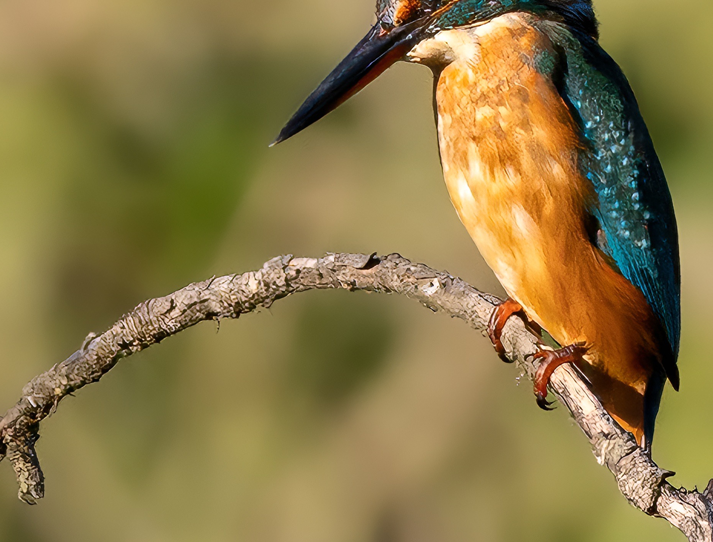 A kingfisher sits on a thin, grey branch against a blurred green background. The bird’s plumage displays bright orange and turquoise with a