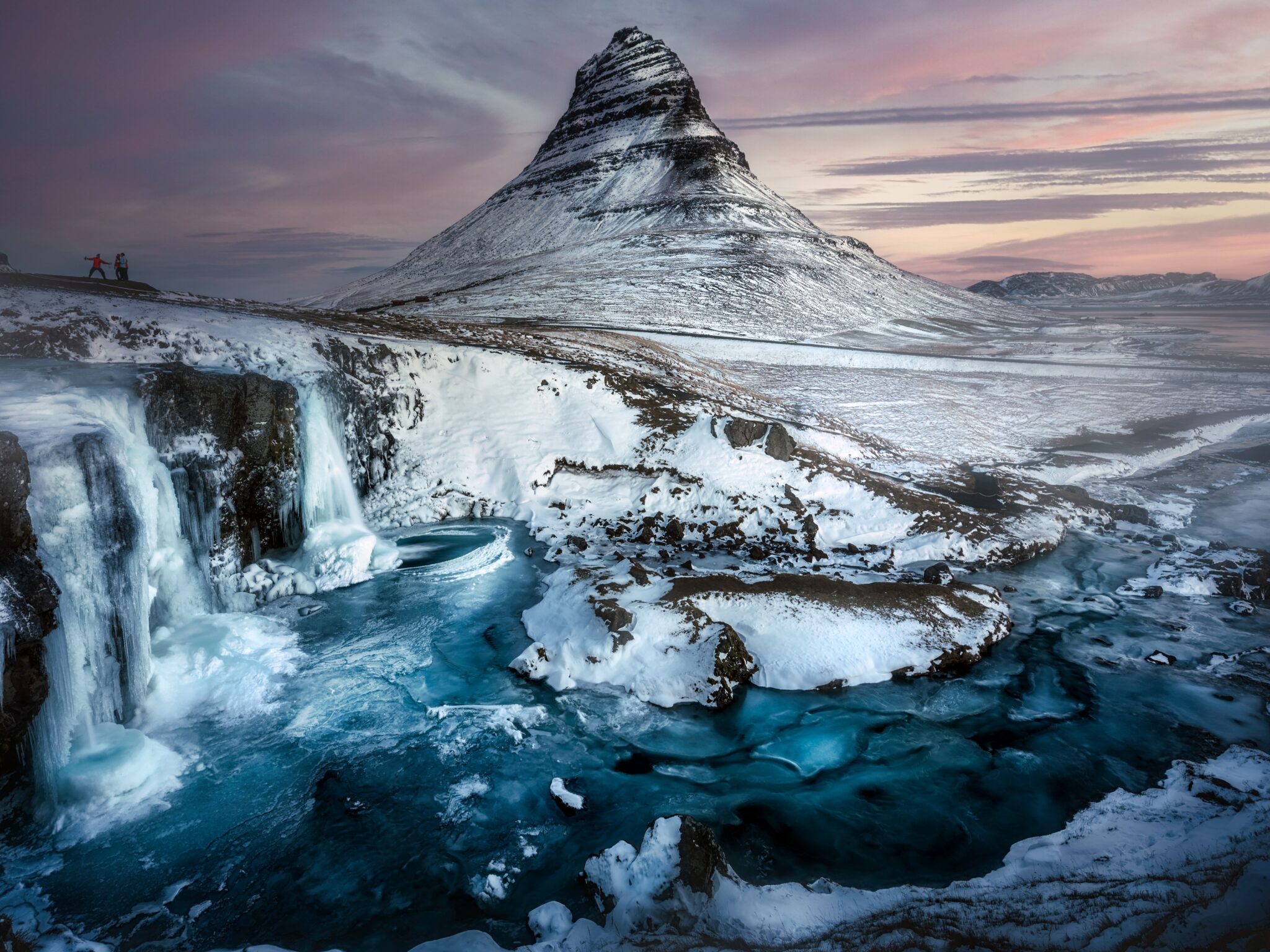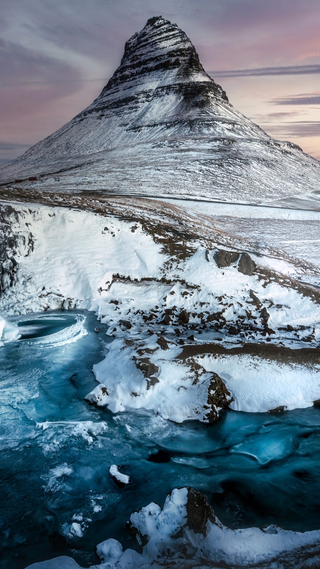 A snow-covered mountain overlooks a wide river with cascading waterfalls in the foreground. The cool blue water contrasts with the pale pink…