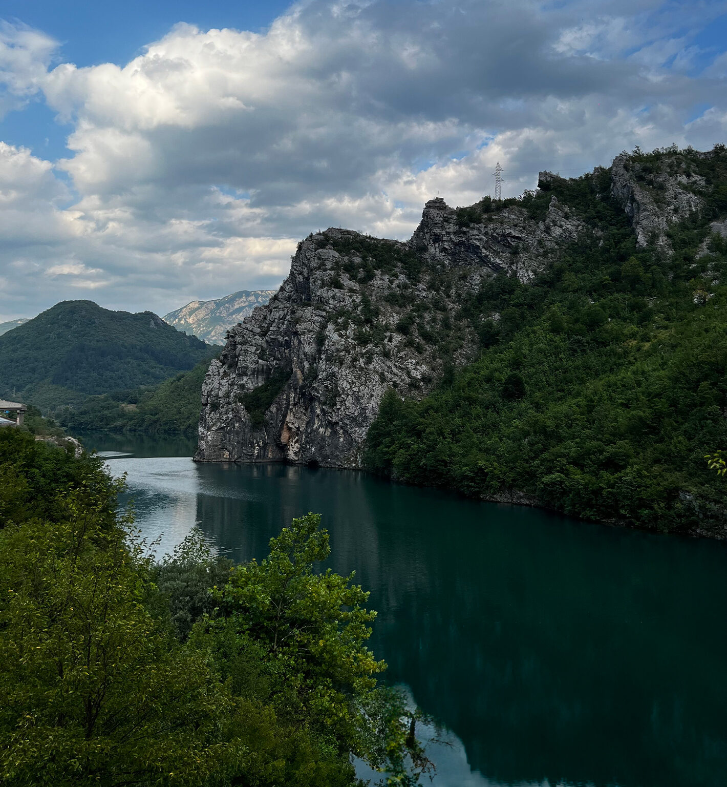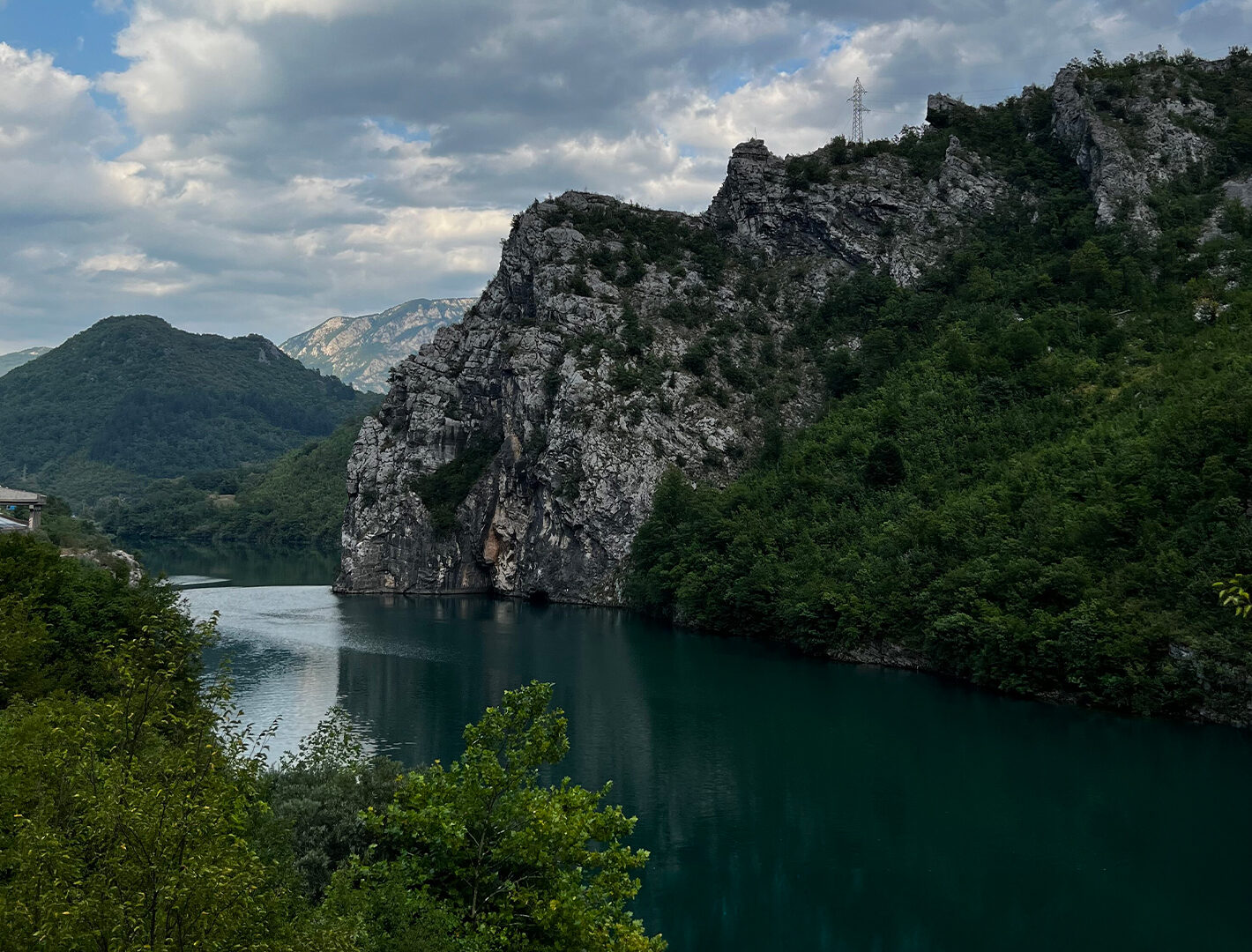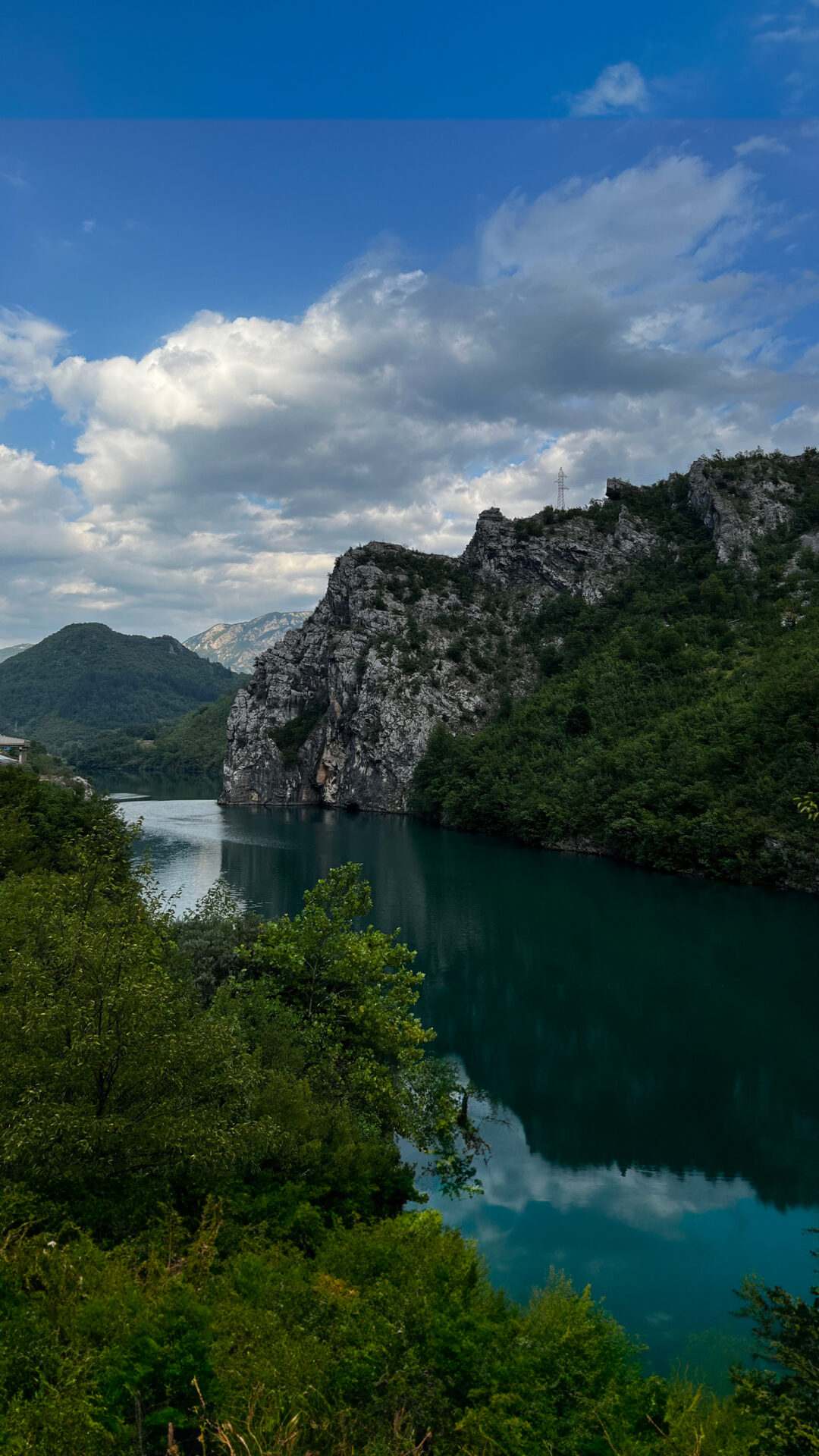 A turquoise lake is framed by steep, rocky cliffs covered in dense green trees. The clear water reflects the cloudy blue sky and the rugged