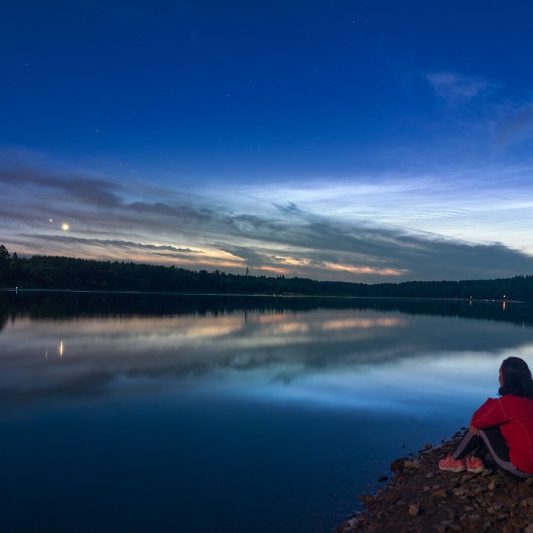 A person sits on the bank of a calm lake, facing a wide horizon. The night sky displays streaks of blue and pale yellow light reflecting on the water’s surface.