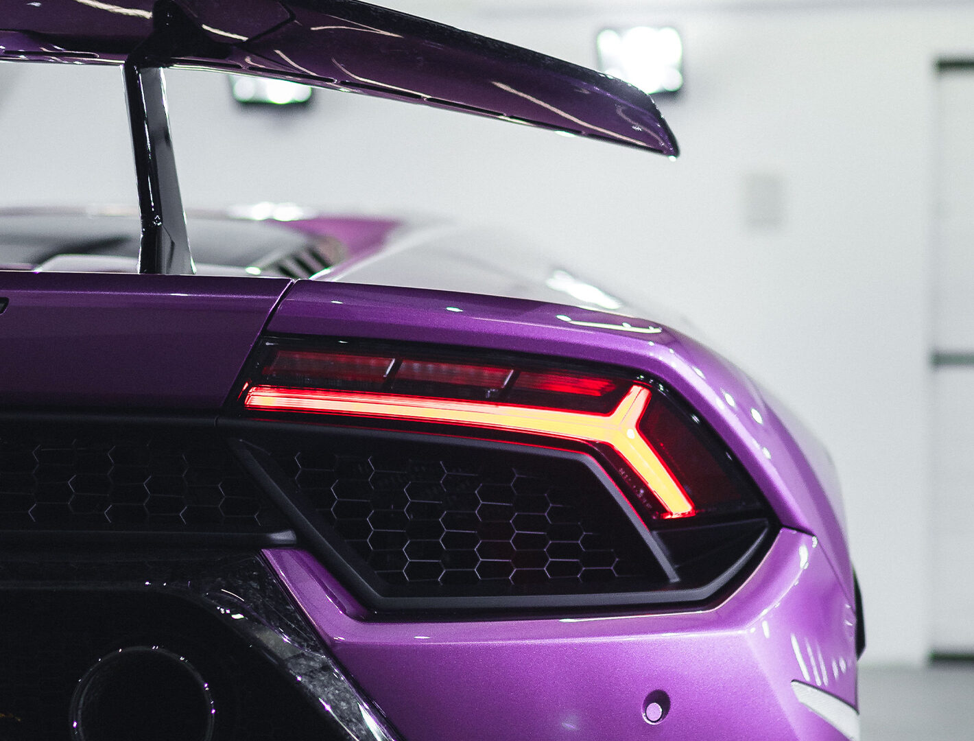 A purple Lamborghini Huracán is parked inside a bright, open garage. The car’s angular bodywork and red taillights contrast with the matte g