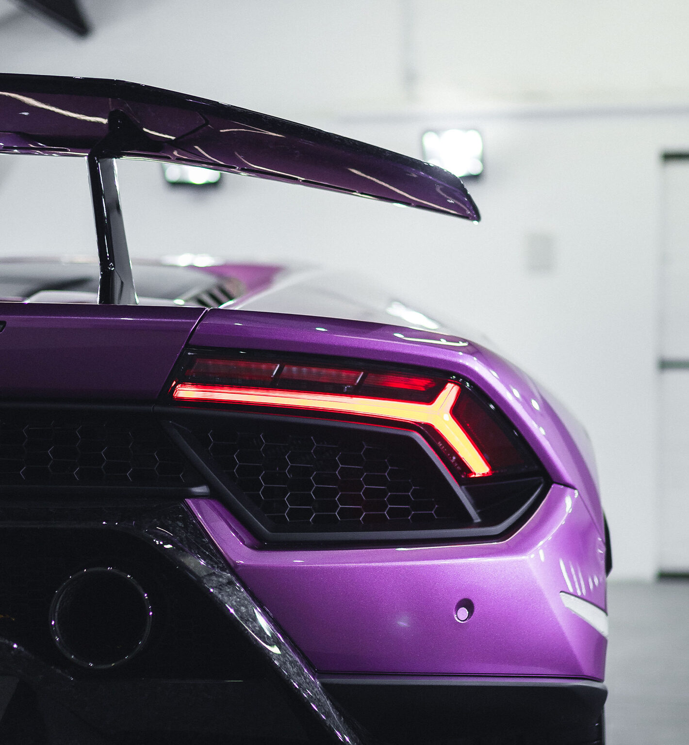 A purple Lamborghini Huracán is parked inside a bright, open garage. The car’s angular bodywork and red taillights contrast with the matte grey flooring and white walls.