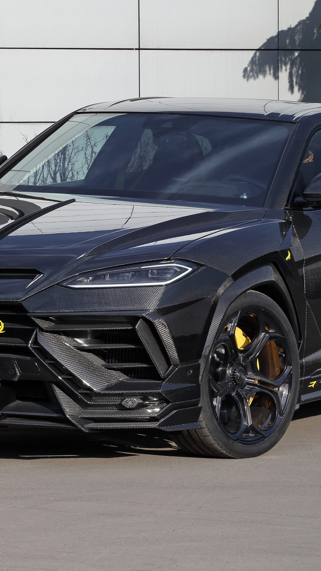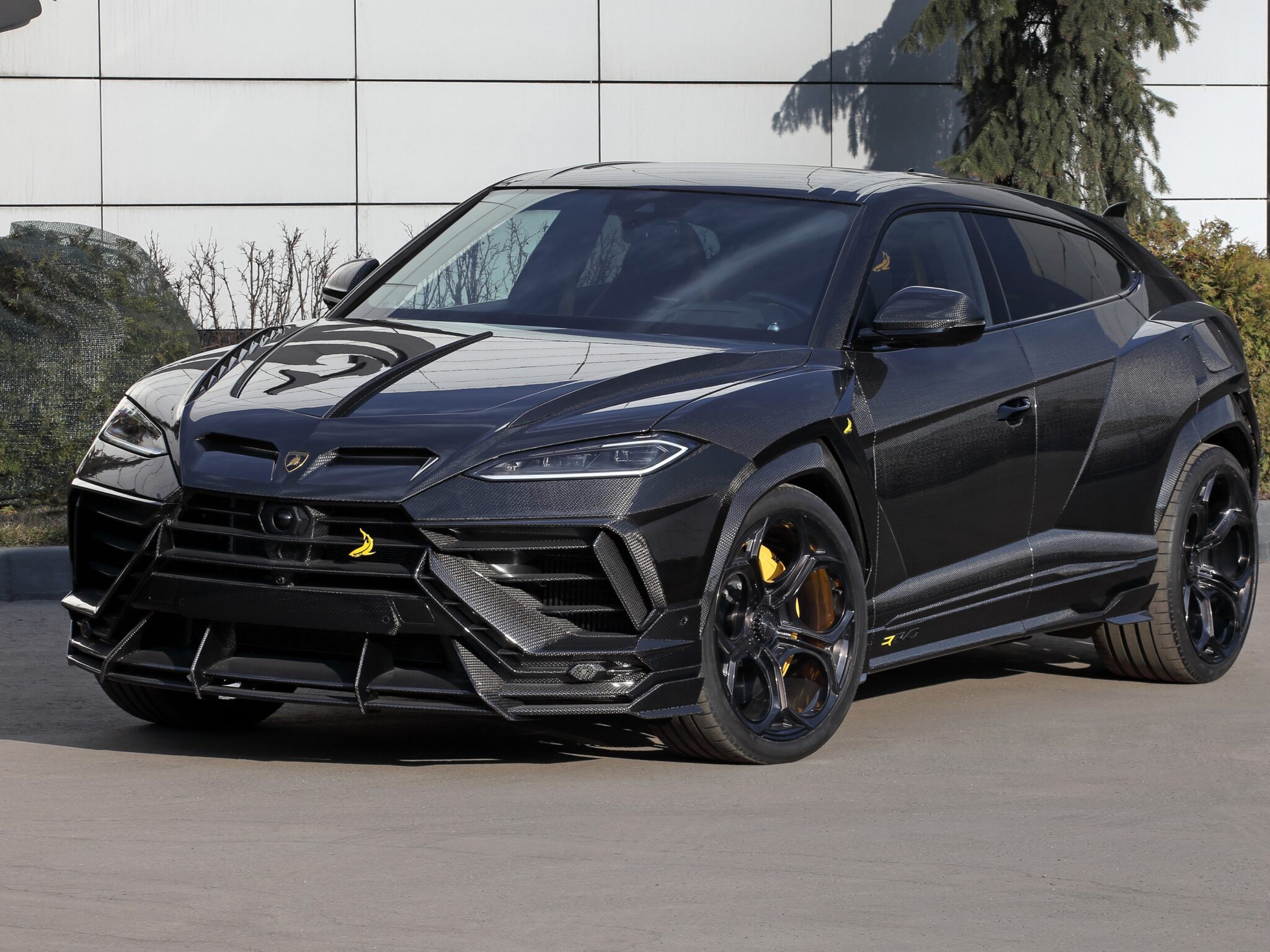 A black Lamborghini Urus is parked on a paved surface near a modern building. Yellow brake calipers provide a sharp contrast against the dar…