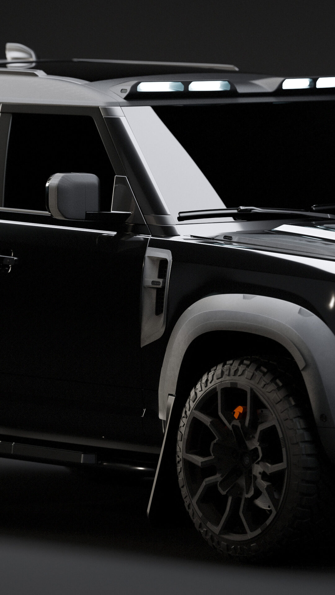A black Land Rover Defender pickup truck is angled slightly from the front. The dark gray and silver color scheme emphasizes the vehicle’s a…