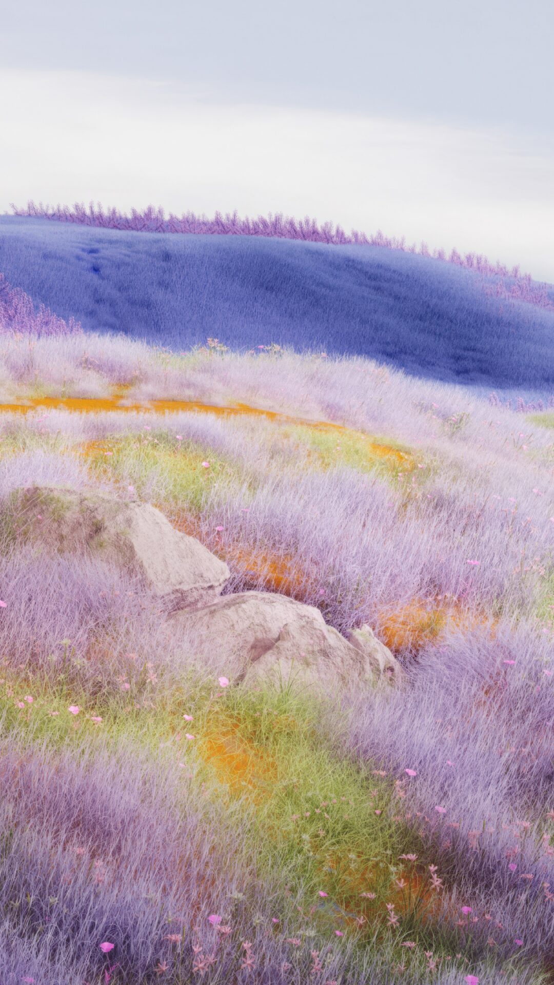 A rolling landscape with rocky outcroppings extends towards a distant hill and a large, smooth sphere. Soft, diffused light emphasizes the t