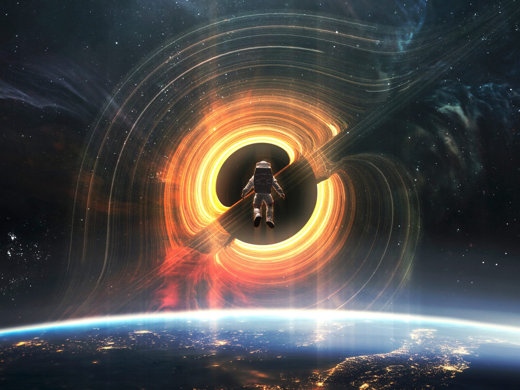 An astronaut floats within swirling orange and yellow light rings above Earth's illuminated surface against the dark cosmos. Made for 4K mon