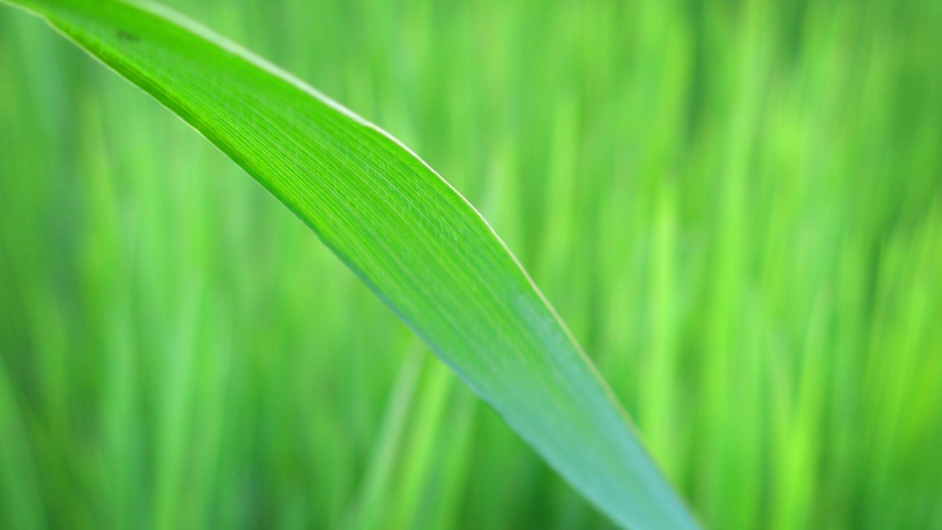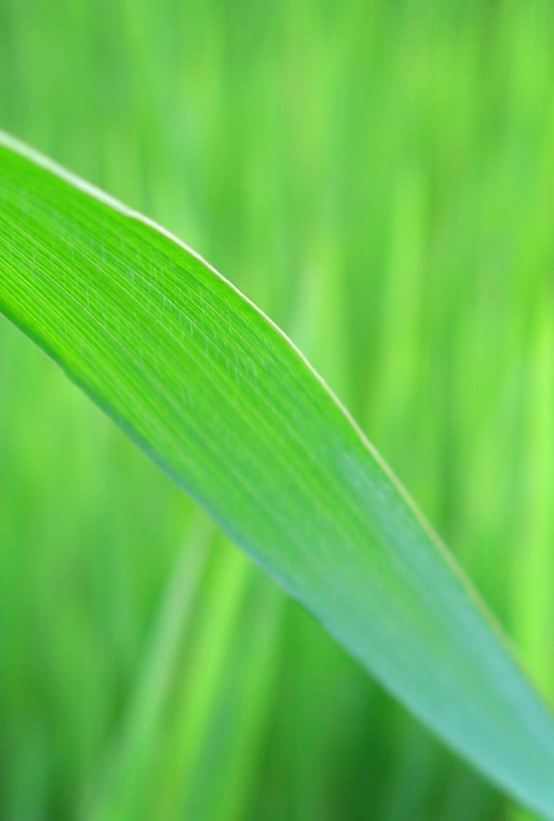 A single grass blade cuts diagonally across the frame in vivid lime green, its fine striations sharp against a soft bokeh of more blades behind it. Simple, clean, and quietly alive.