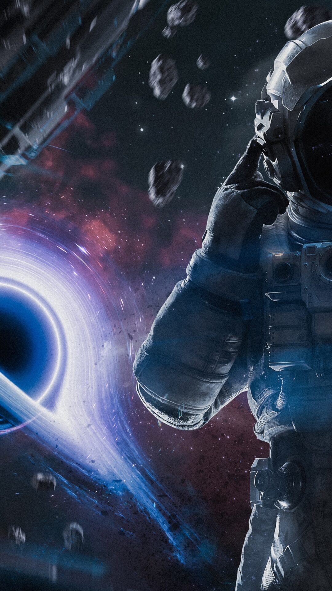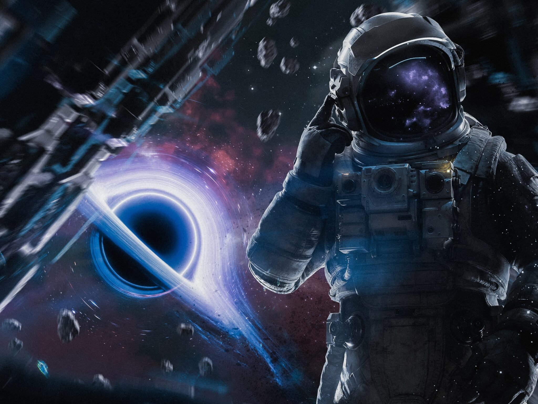 Lone astronaut floating near a massive black hole with a glowing white and blue accretion disk, surrounded by purple and red nebula clouds and scattered debris from a space station. For 4K monitors.