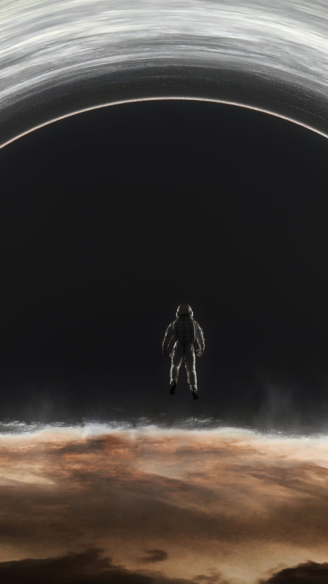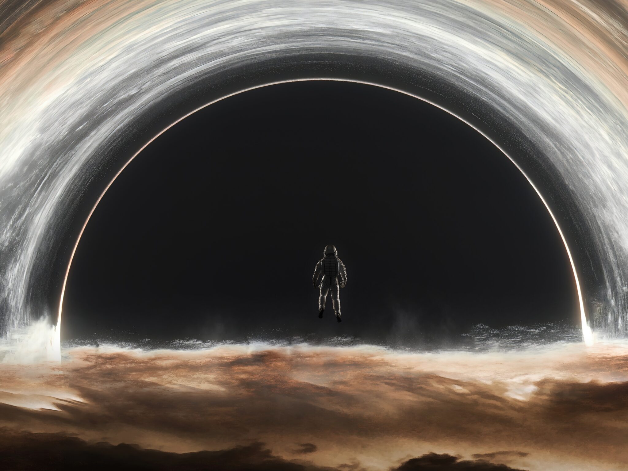 A solitary astronaut stands before a massive black hole's event horizon, surrounded by swirling bands of orange, white, and gray matter stre…