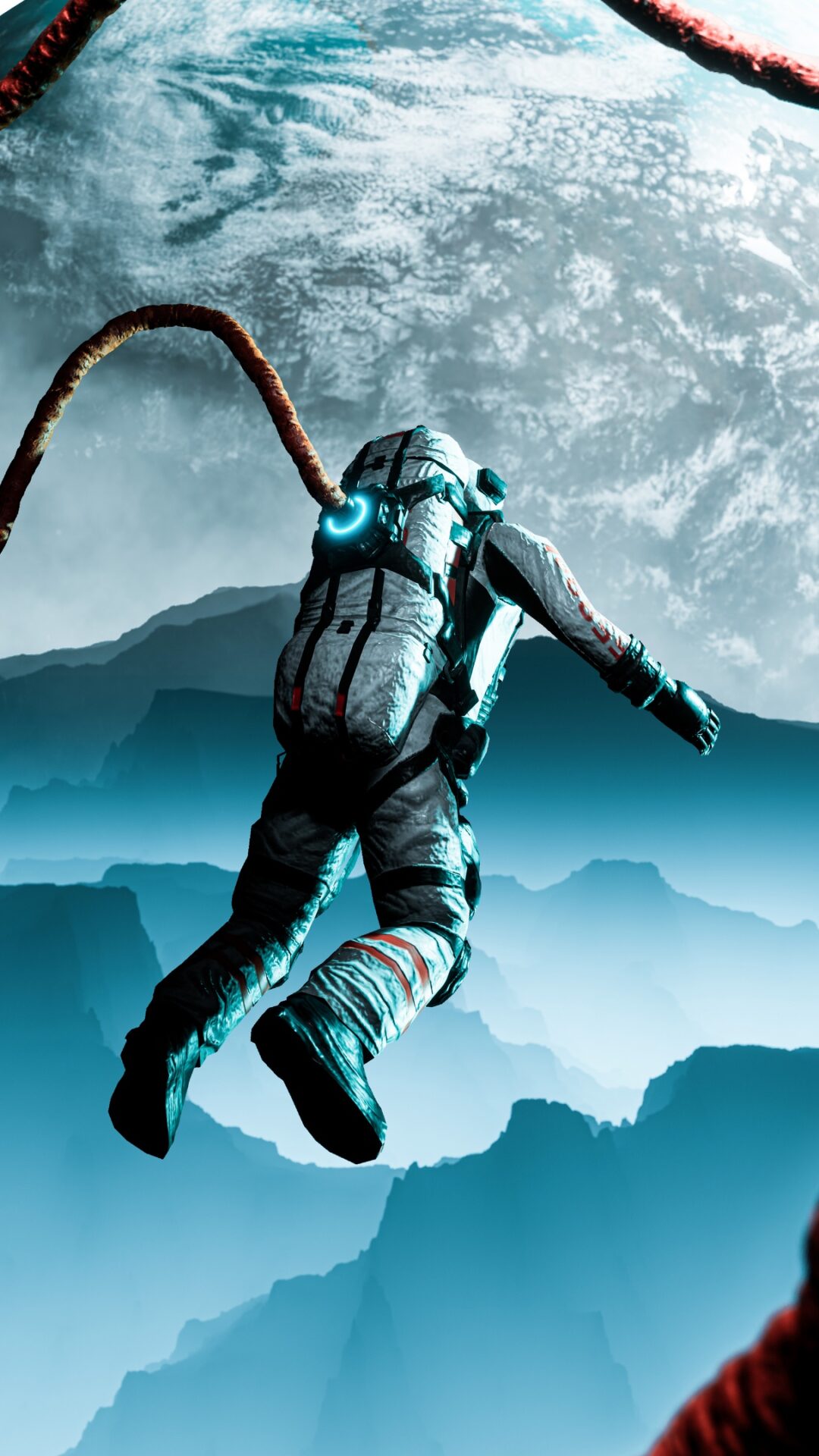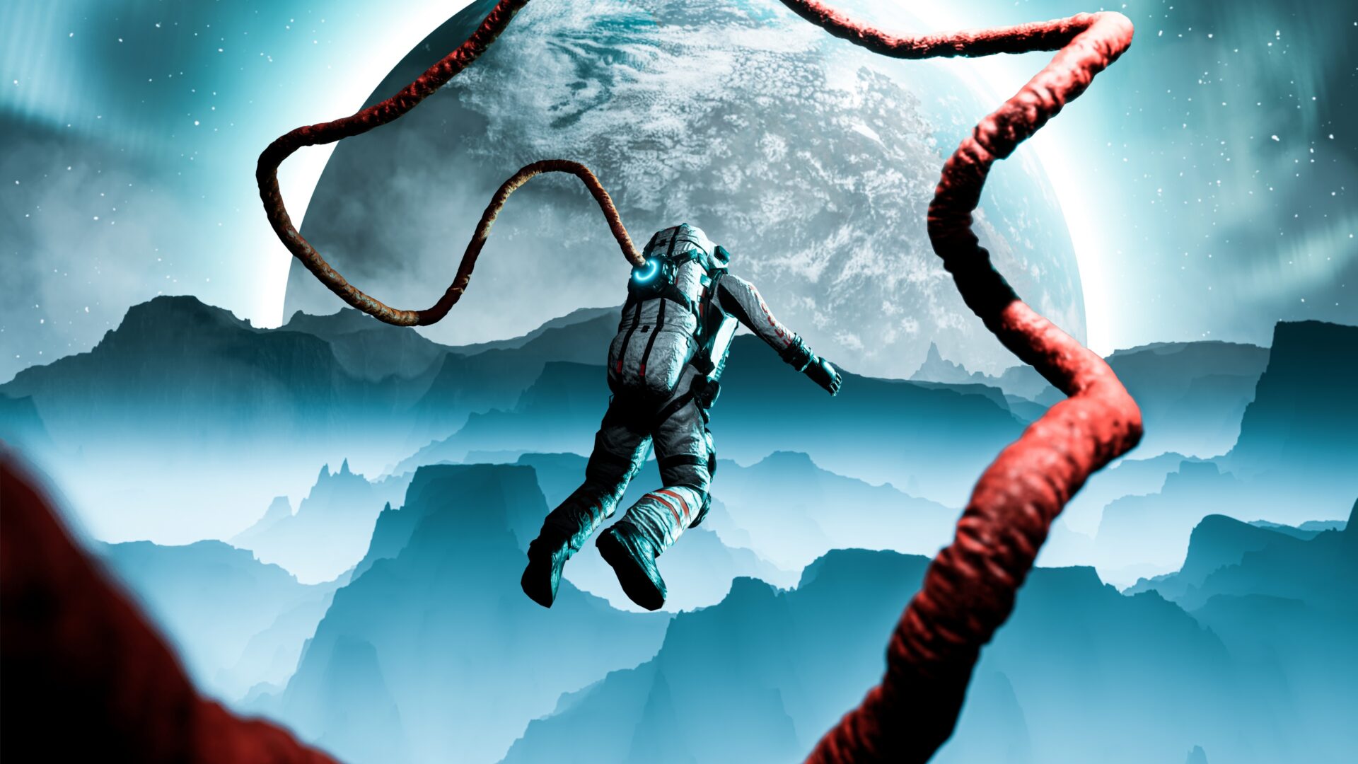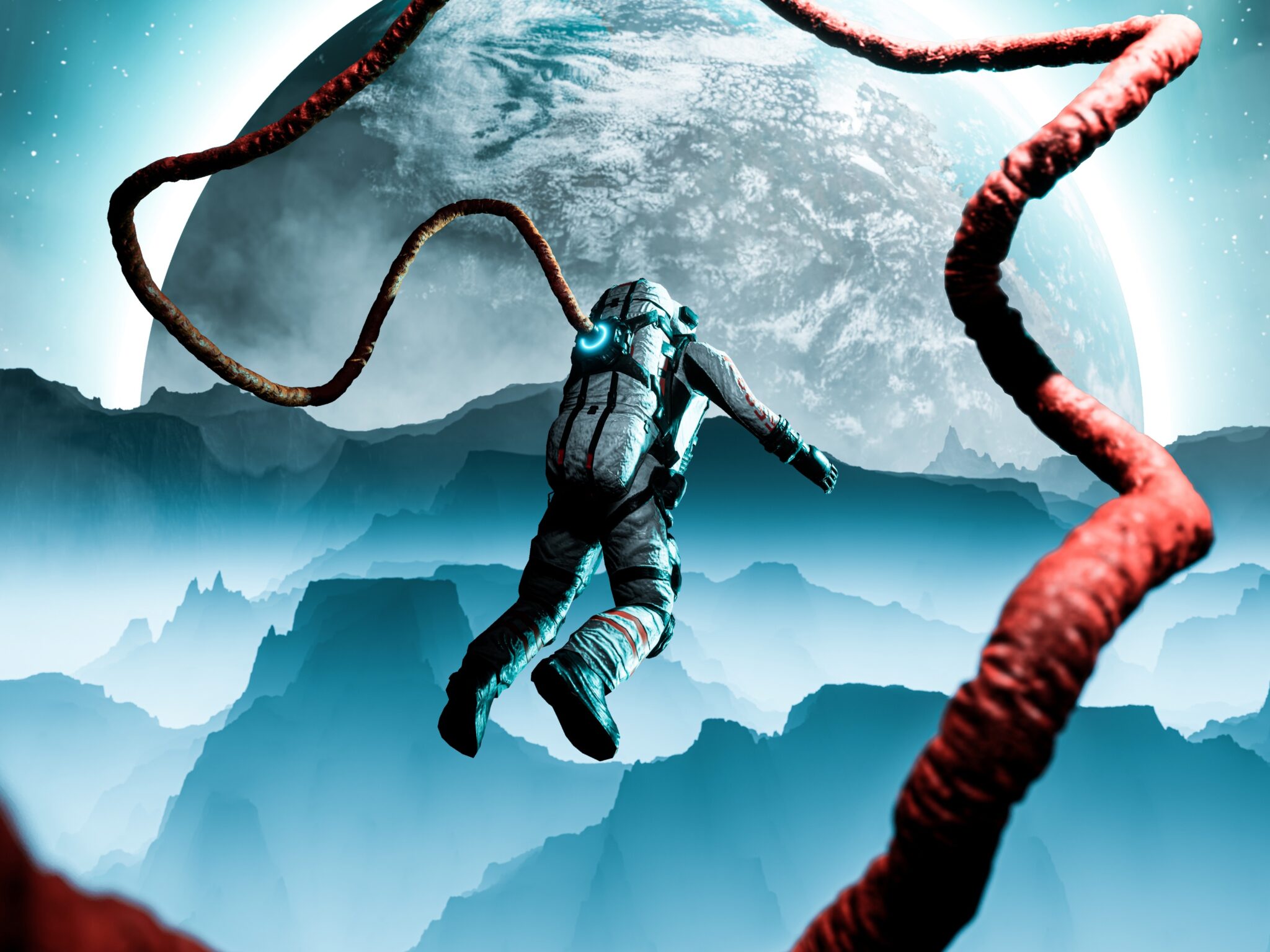 Astronaut floats through a surreal landscape with towering blue mountains, a massive moon overhead, and strange red tentacle-like structures