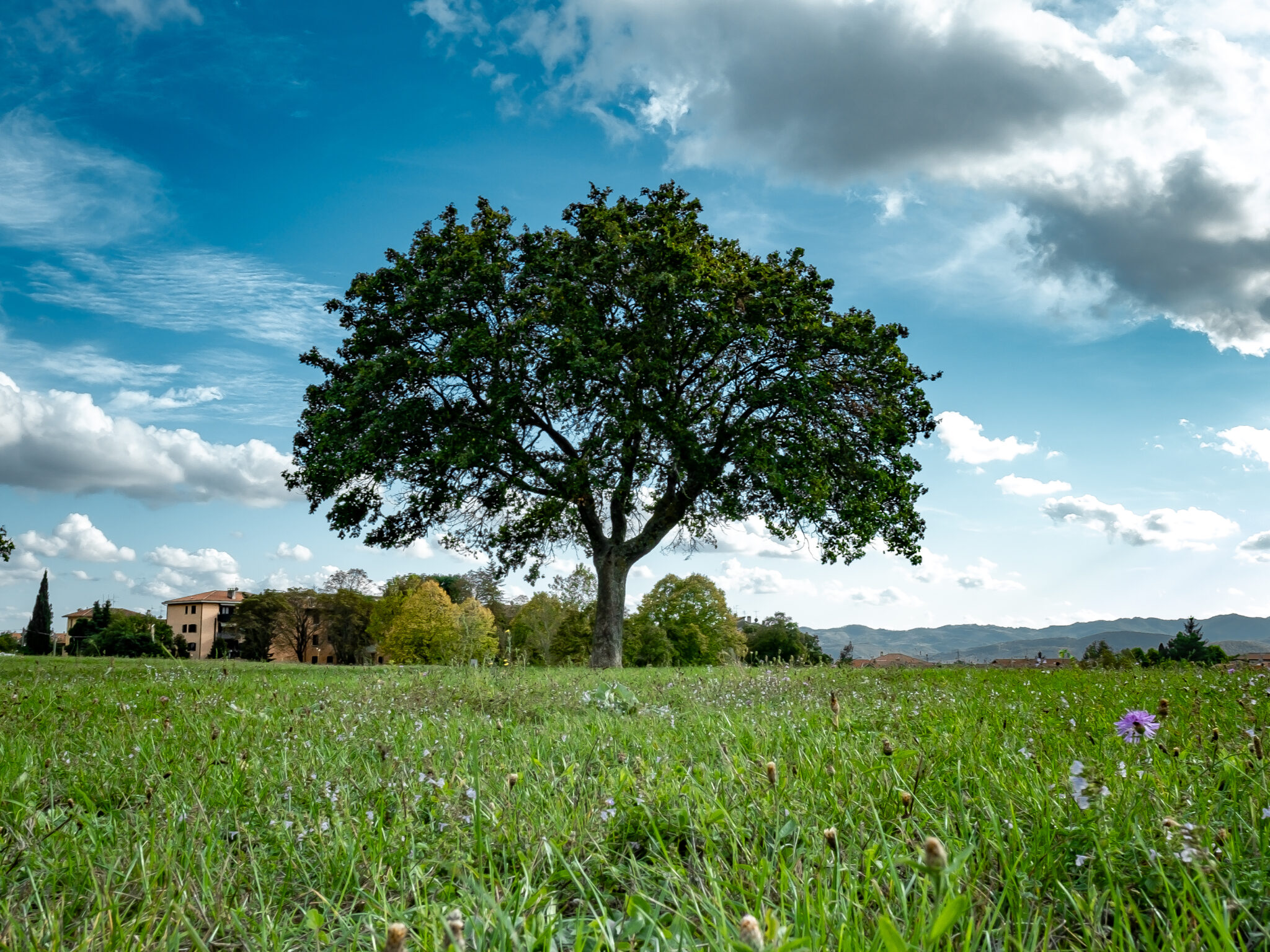 A large tree stands centered in a bright green field under a cloudy blue sky. Scattered purple wildflowers and detailed grass blades add tex