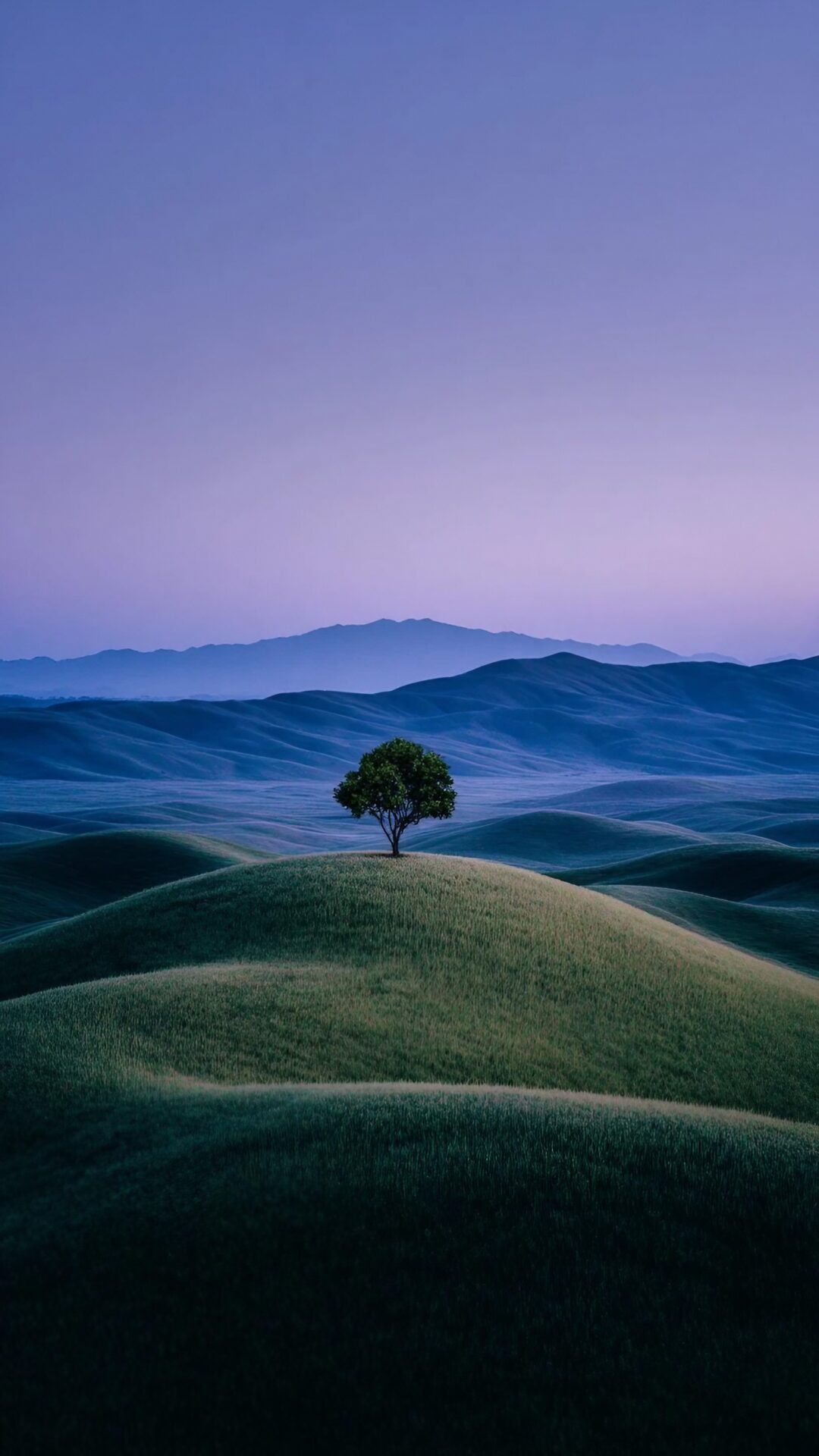 A single tree stands on a rounded hilltop overlooking layered, distant hills. Soft, cool tones of lavender and blue create a sense of depth …