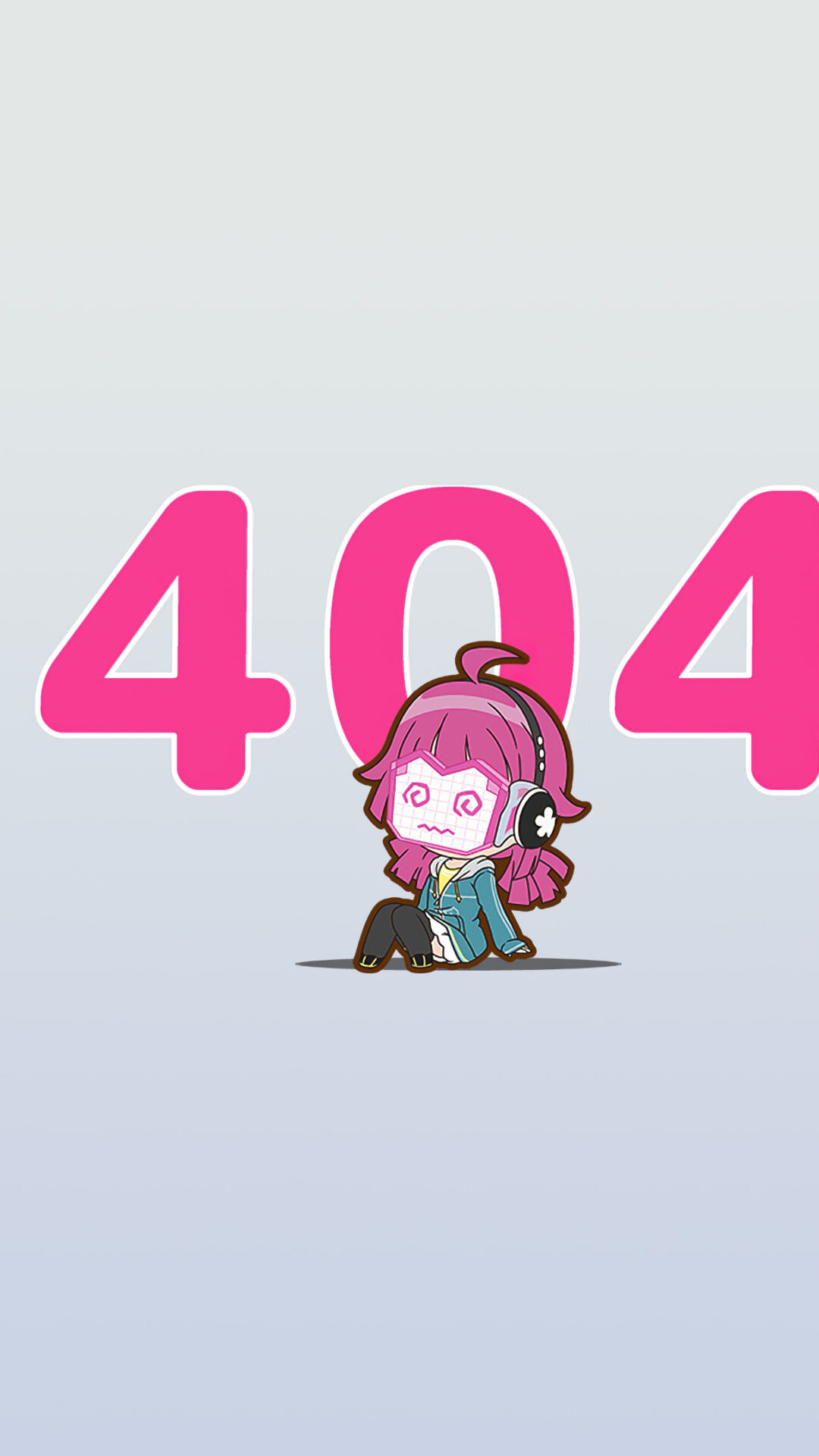 Adorable chibi anime girl with pink hair sits beneath a big pink 404 error message, looking totally lost on a soft gray-blue gradient backgr
