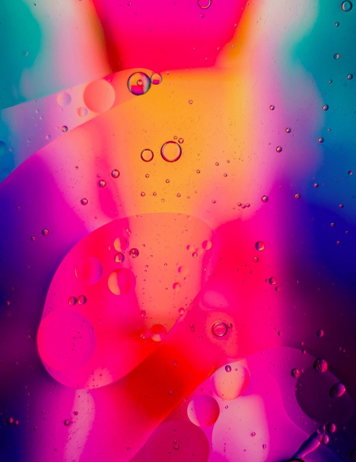Colorful liquid forms are captured in a close-up macro shot, swirling in shades of pink, yellow, and blue. Small bubbles within the droplets