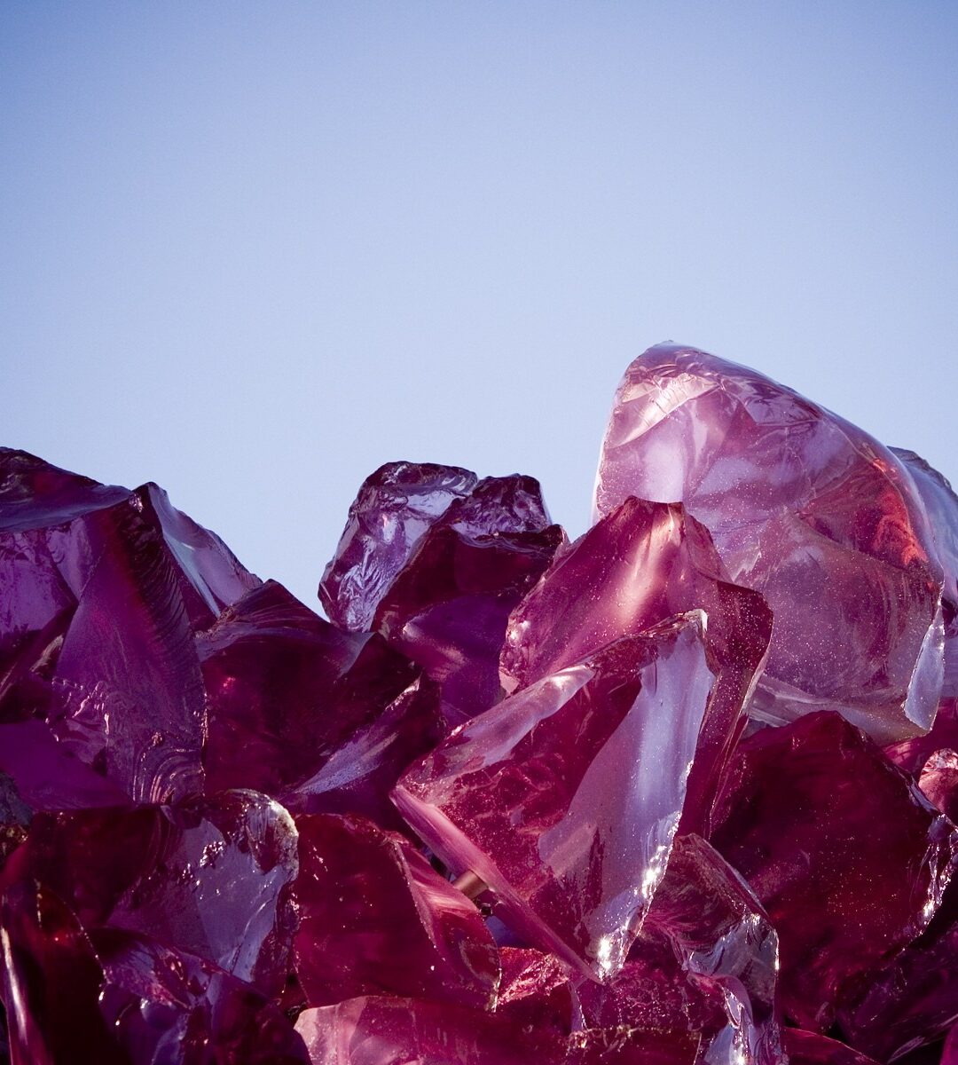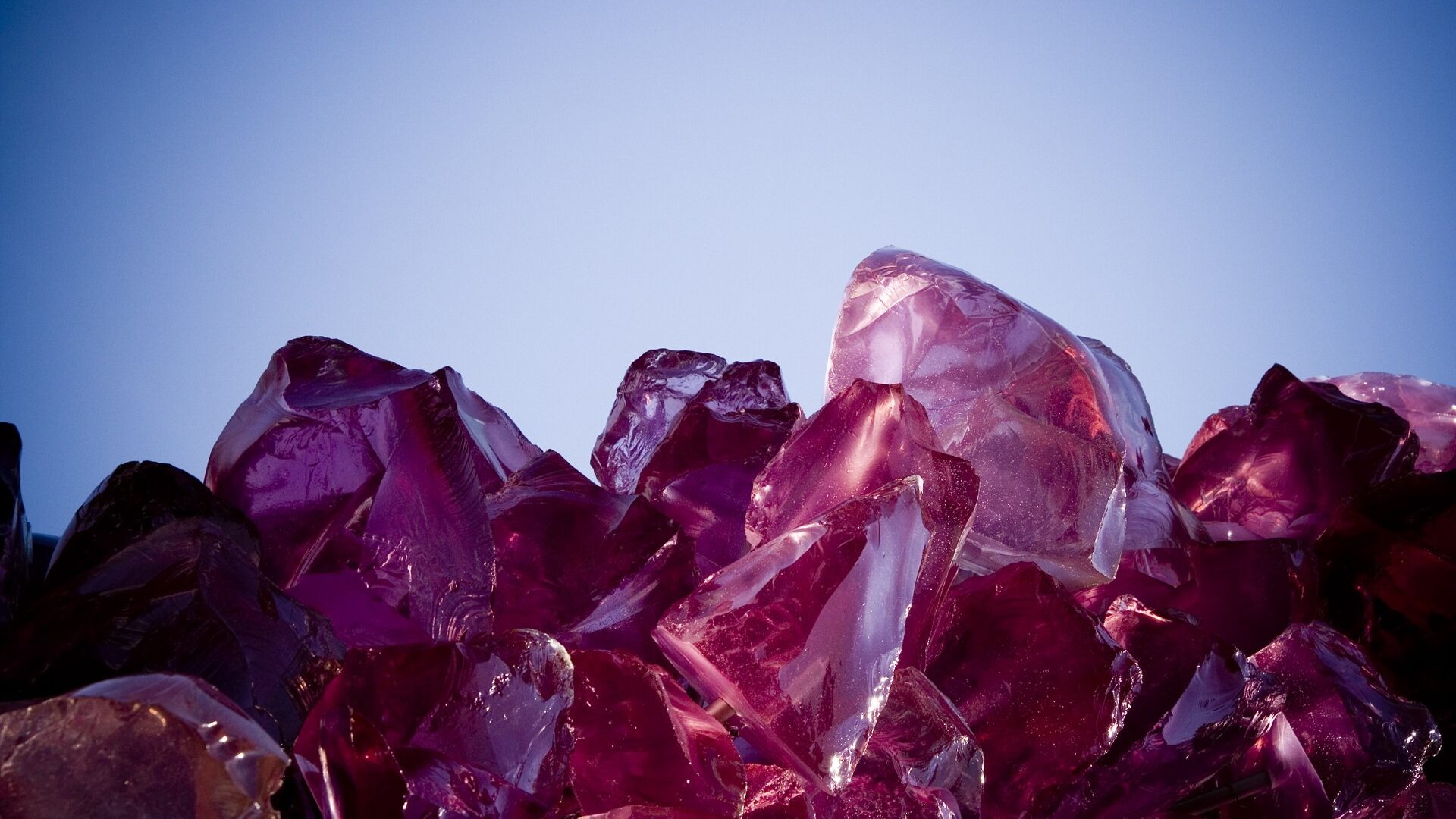 Jagged deep-pink and magenta glass fragments cluster at the bottom of the frame against a rich blue gradient that darkens toward the edges.