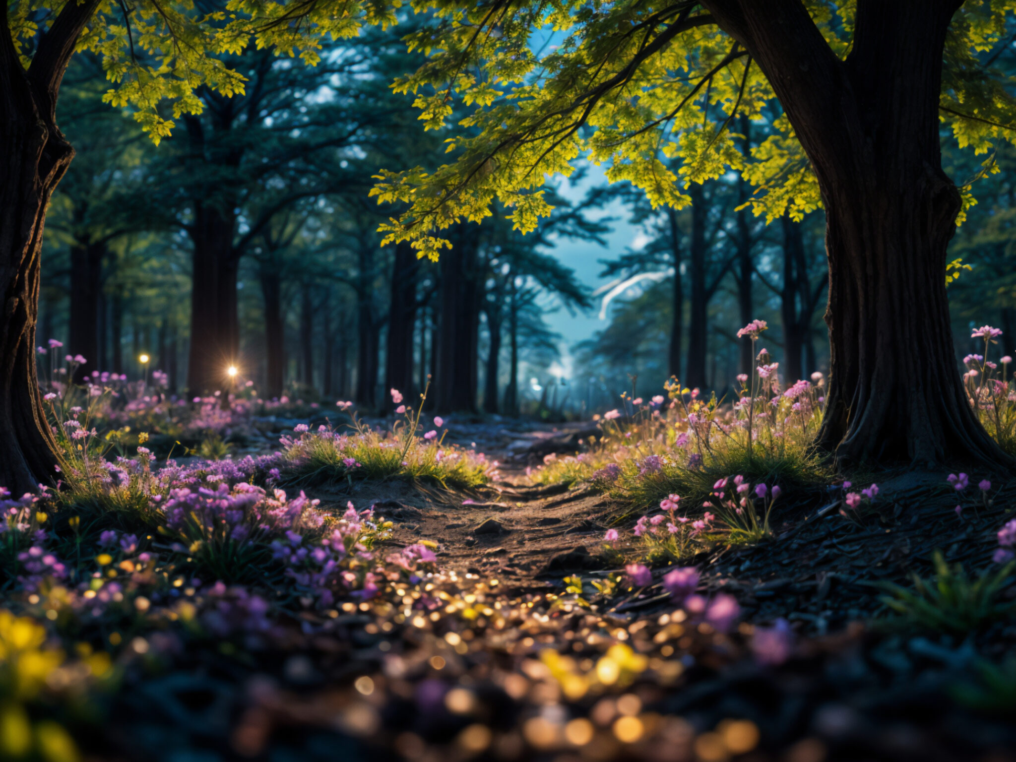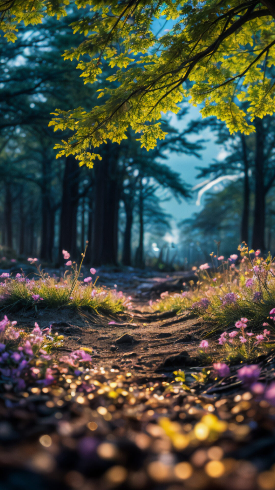 Sunlight filters through green canopy onto a winding dirt path surrounded by purple wildflowers and towering dark tree trunks. Works well fo…