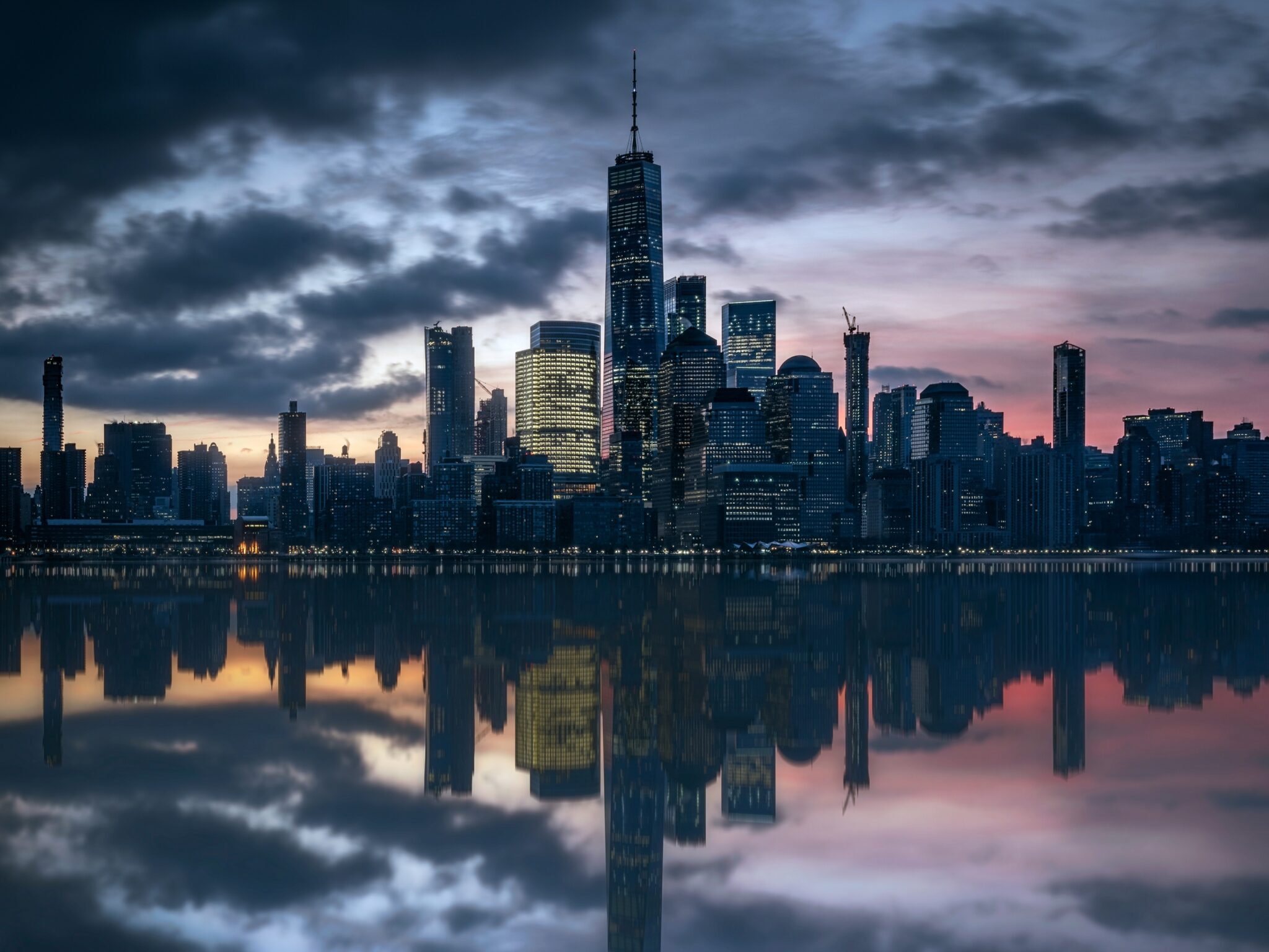 Manhattan's skyline rises against moody slate gray and soft pink sunset clouds, with One World Trade Center dominating the center and city l