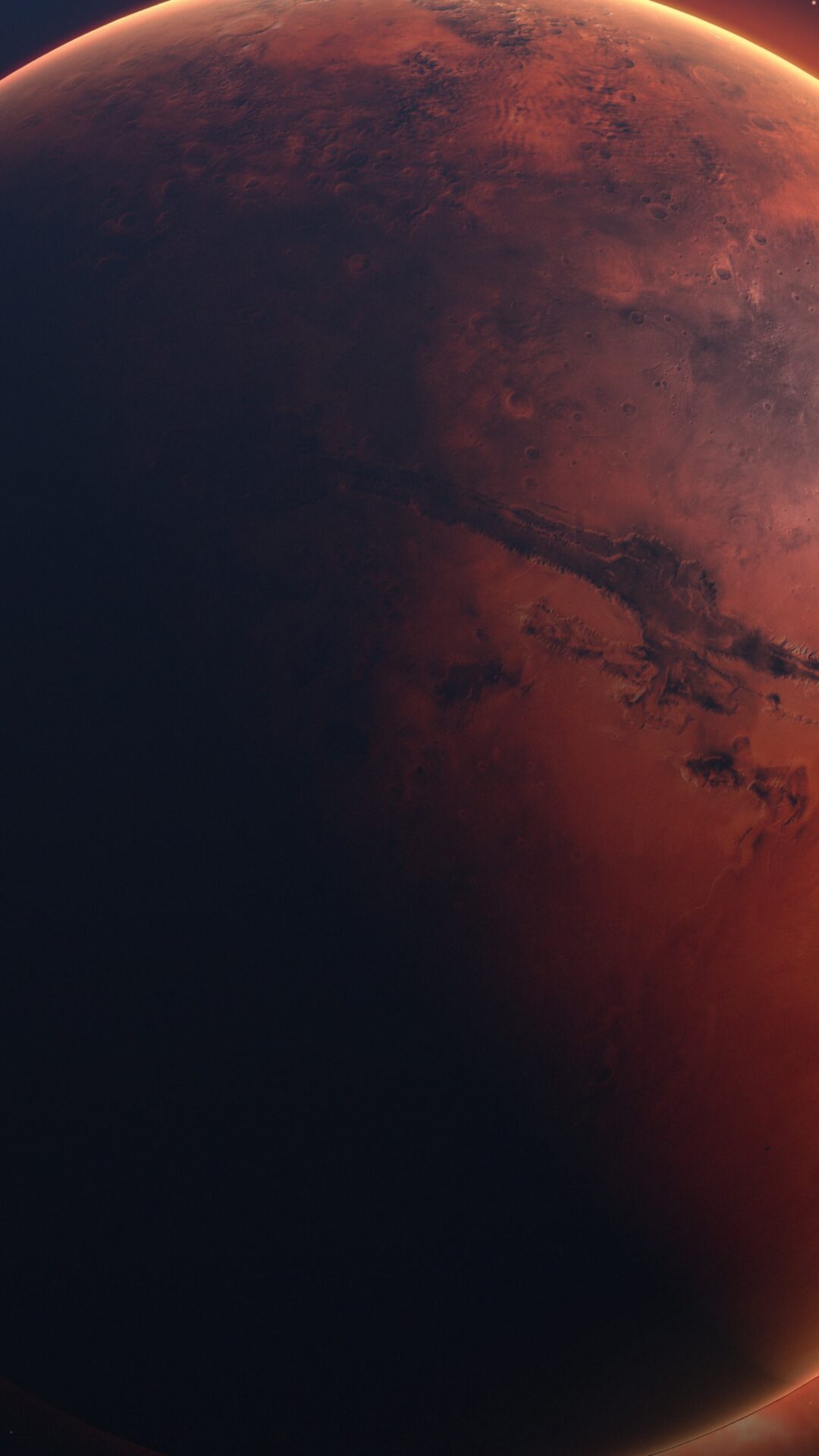 A reddish-brown planet dominates the view against a dark, speckled space background. A soft, orange glow surrounds the planet’s edge, suggesting atmospheric light and a stark contrast with the shadowed side.