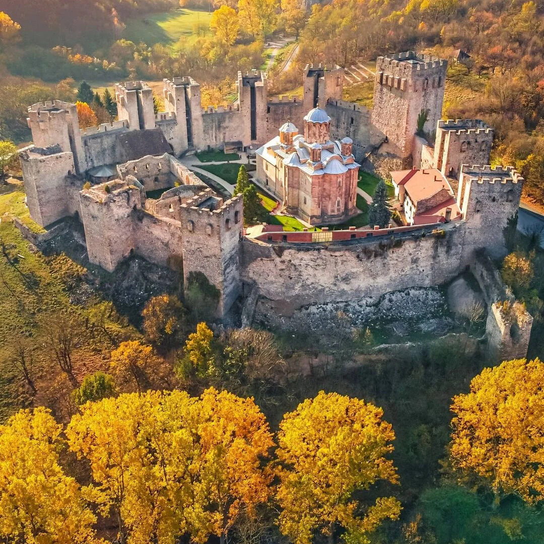 An ancient stone fortress crowns a wooded hill, its pink-domed church glowing against a sea of orange and gold canopy. Golden hour light wraps the whole scene in something between fairy tale and history.