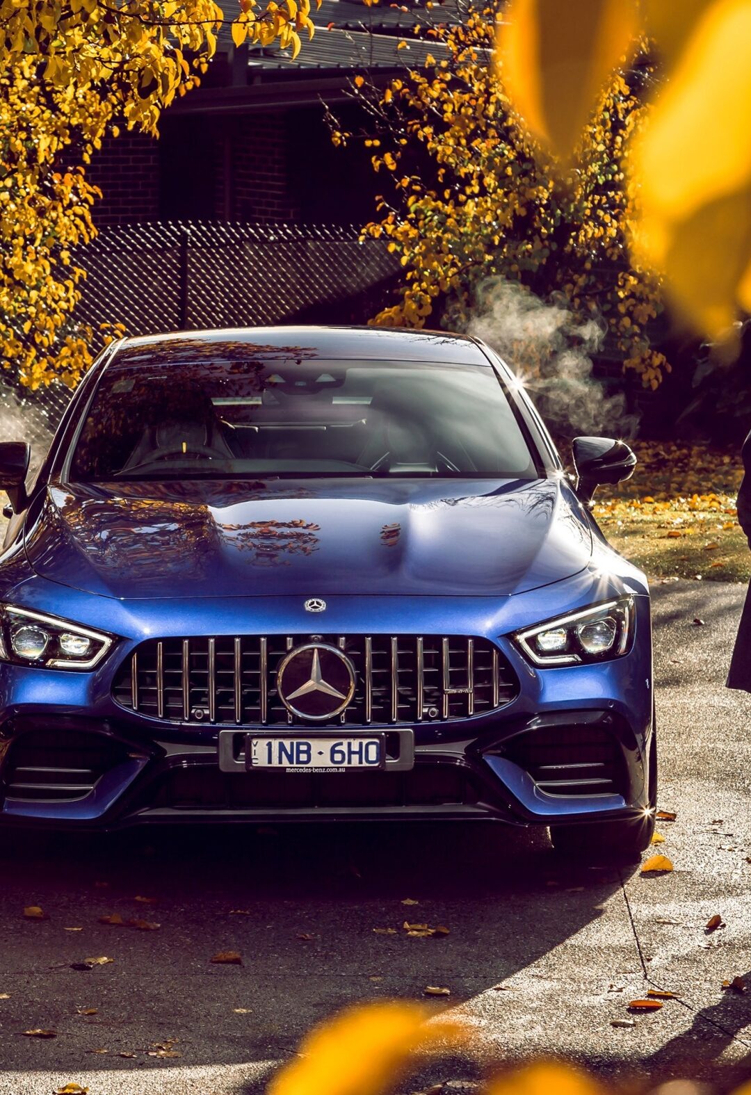 A blue Mercedes-AMG GT is parked on a gravel road with steam rising from the hood and a person walking away. Golden autumn leaves partially …