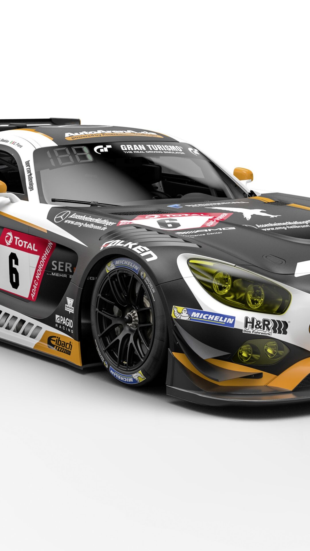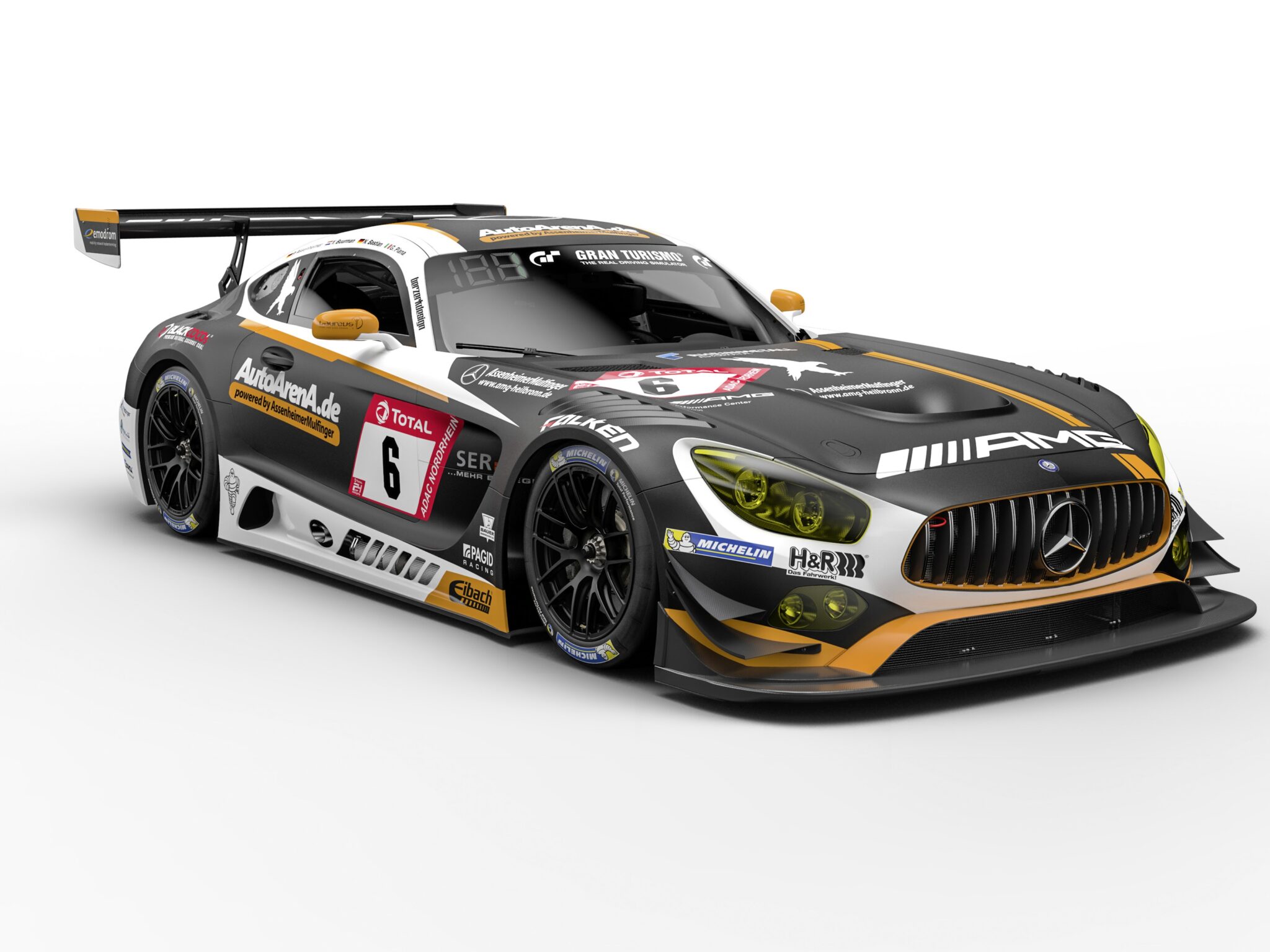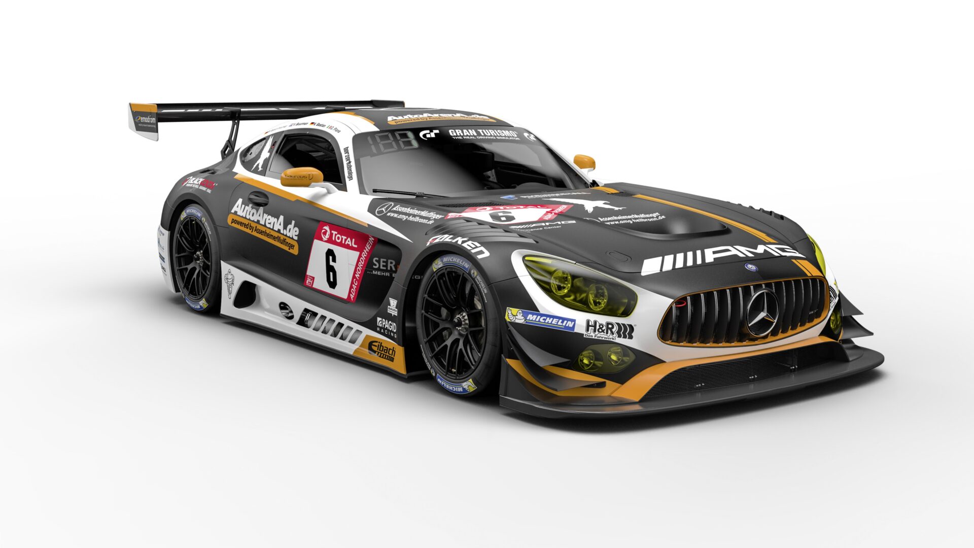 A clinical studio render of the AMG GT3 No.6 shot from a high three-quarter angle, all matte charcoal and white with saffron-orange accents