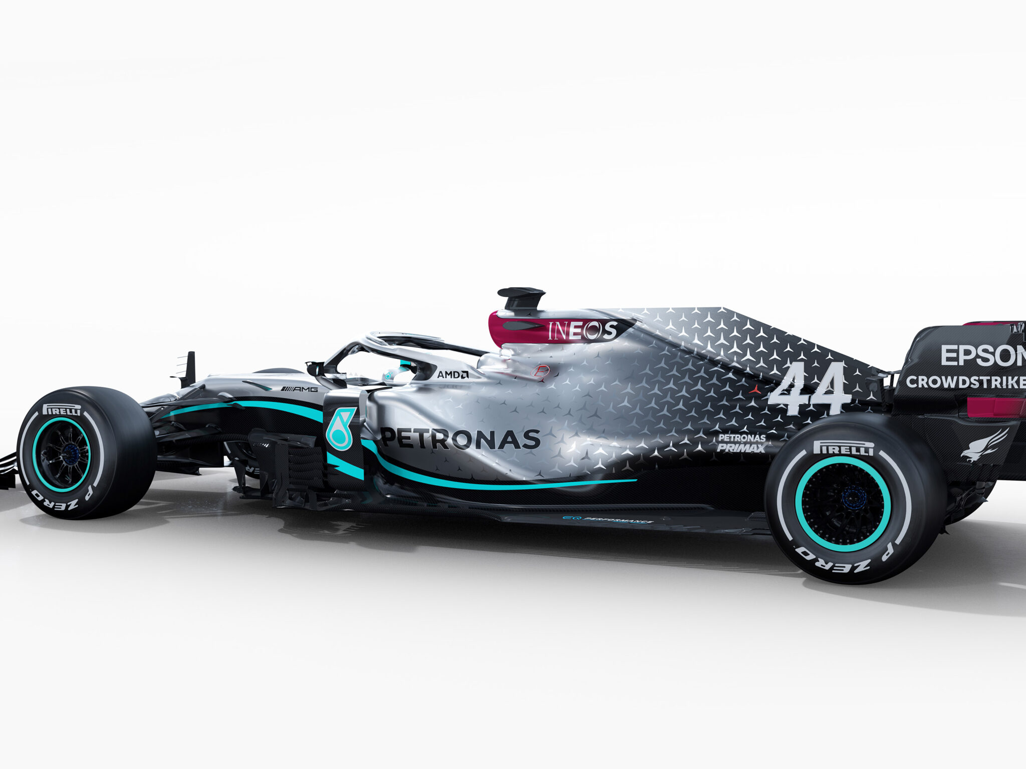 The iconic No.44 W12 E Performance in its metallic silver and turquoise Petronas livery, rendered in a wide, low-angle studio shot that show