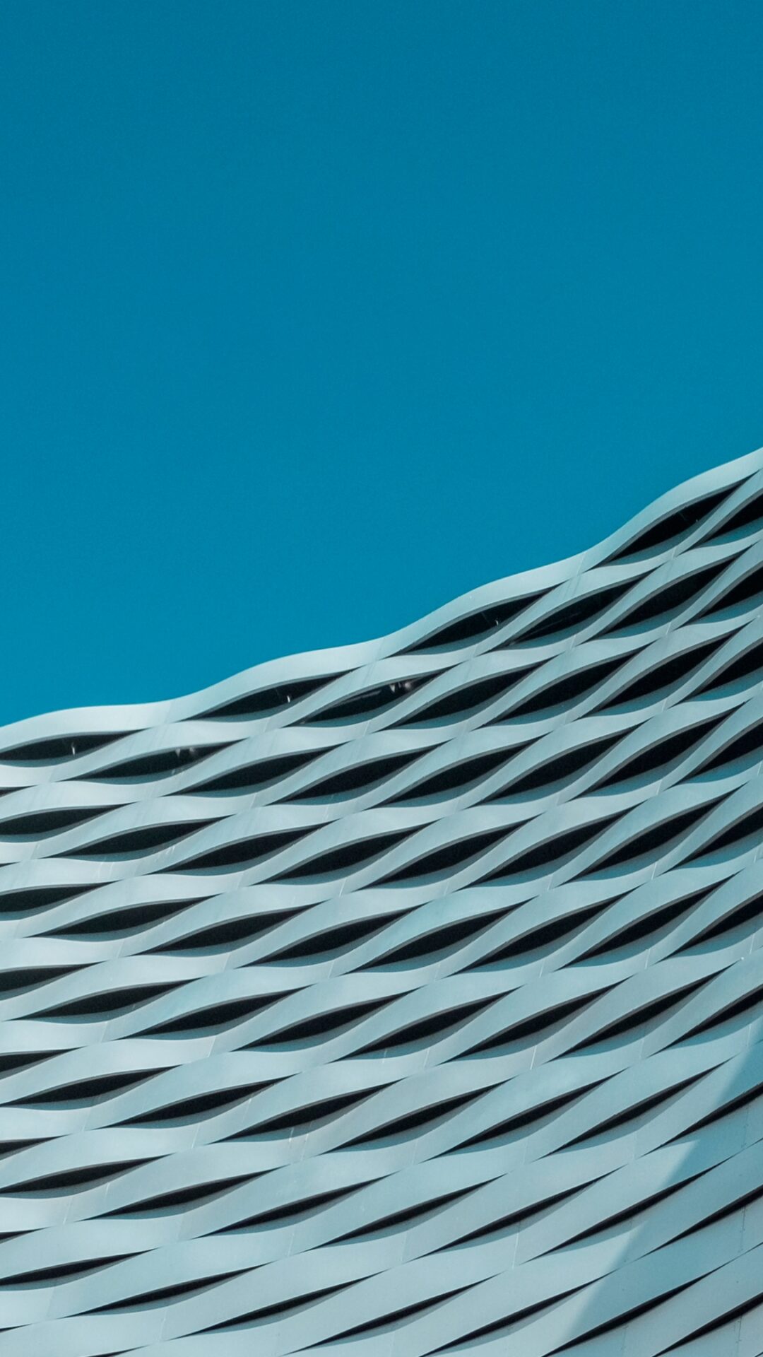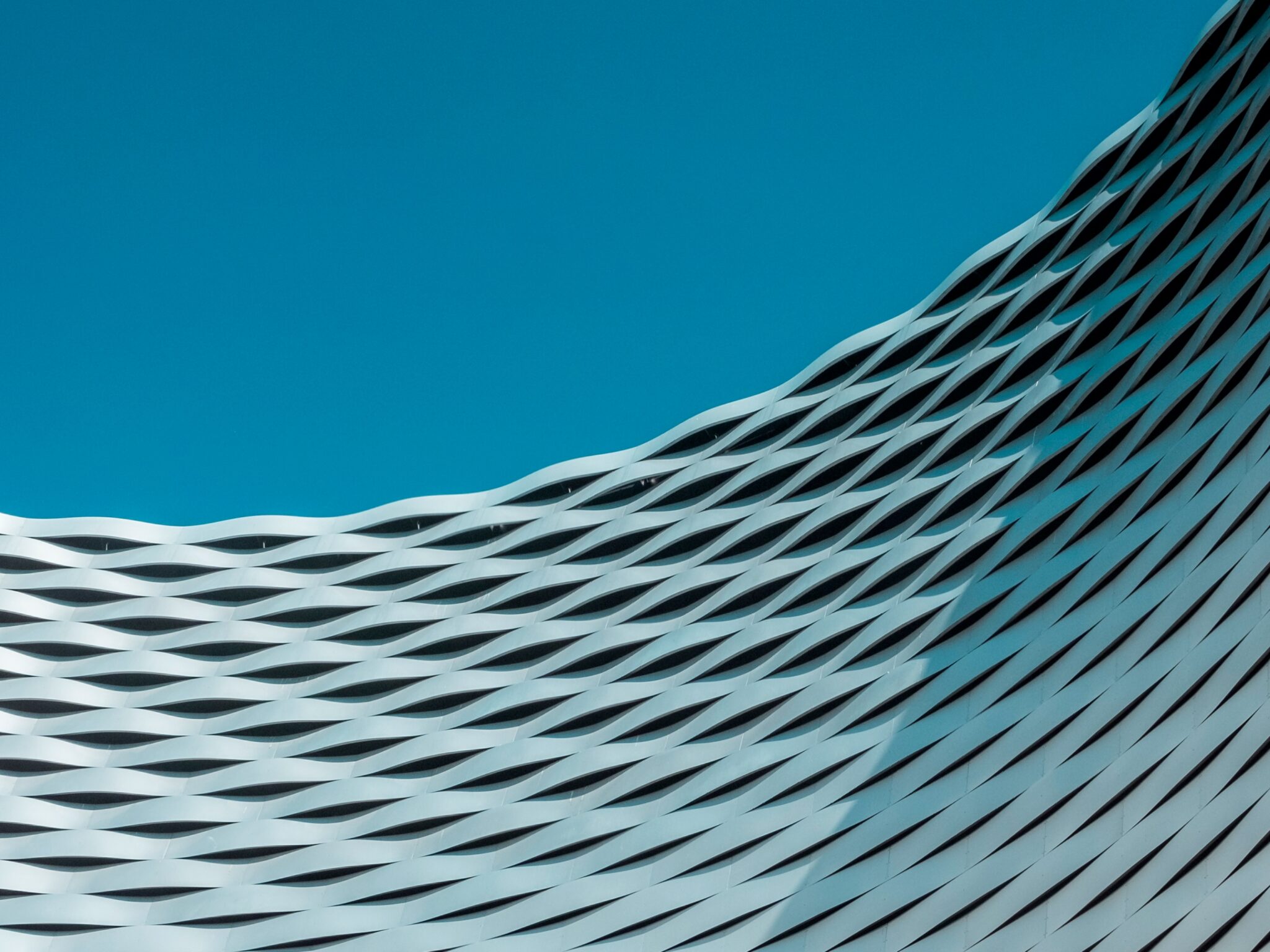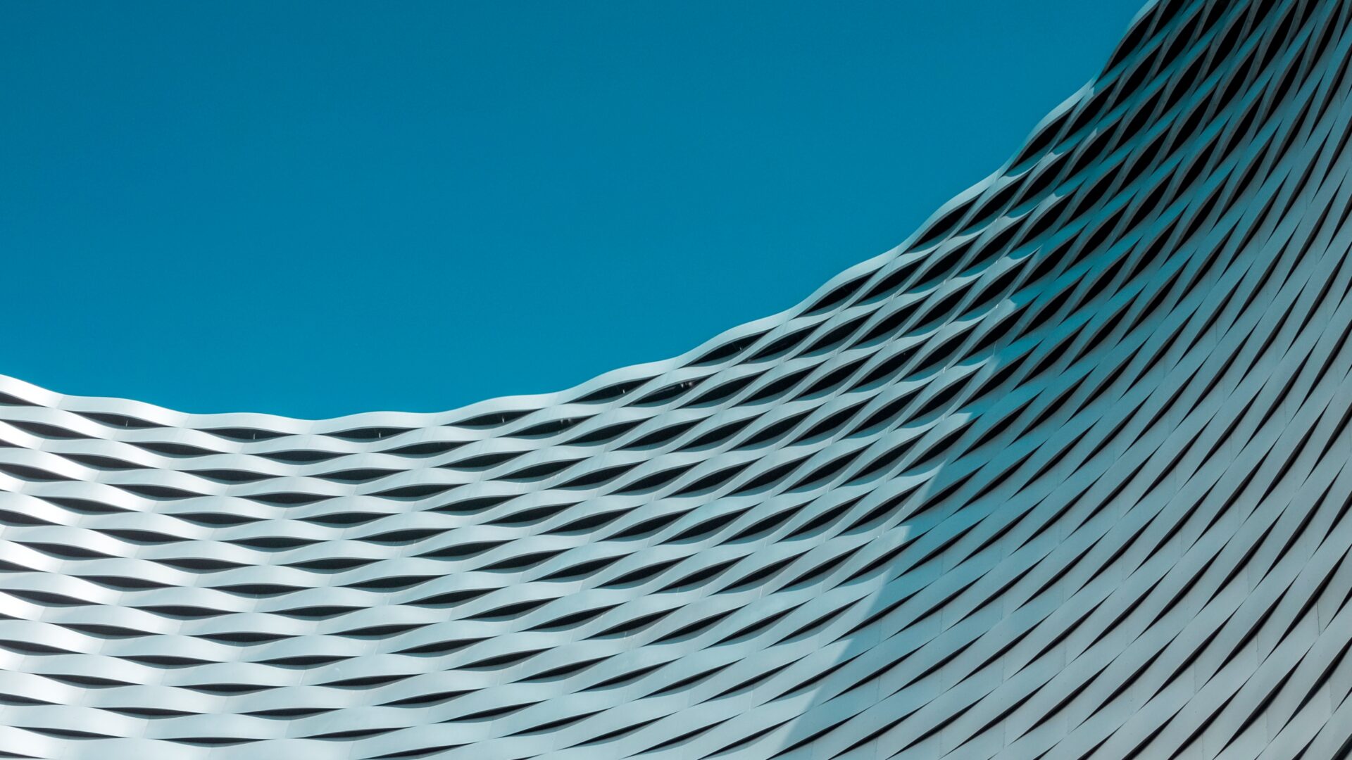 A building’s exterior is shown with a curving facade against a clear blue sky. The dense metal mesh creates a strong pattern of light and shadow with a textured, repeating linear design.