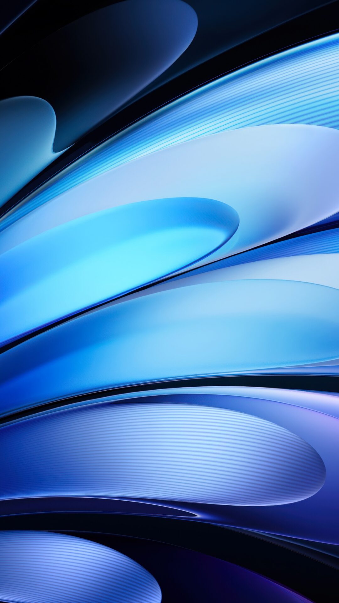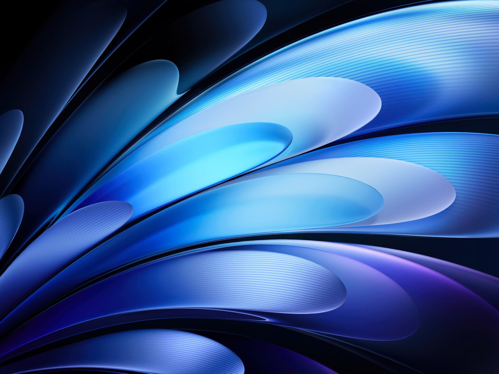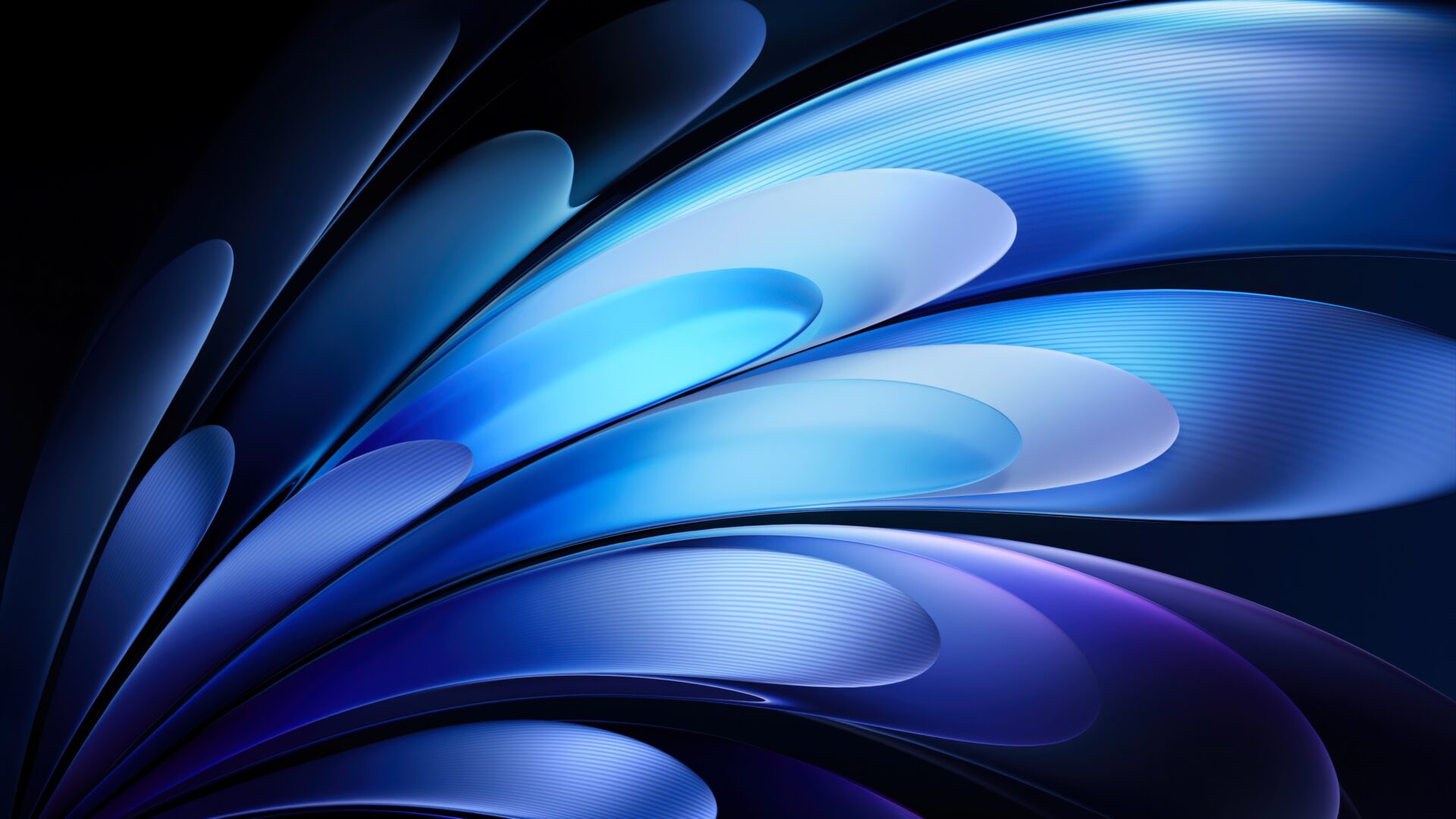 Flowing curved petals in deep midnight blue, cyan, and soft silver unfold against a dark background, creating a sleek abstract design with s…