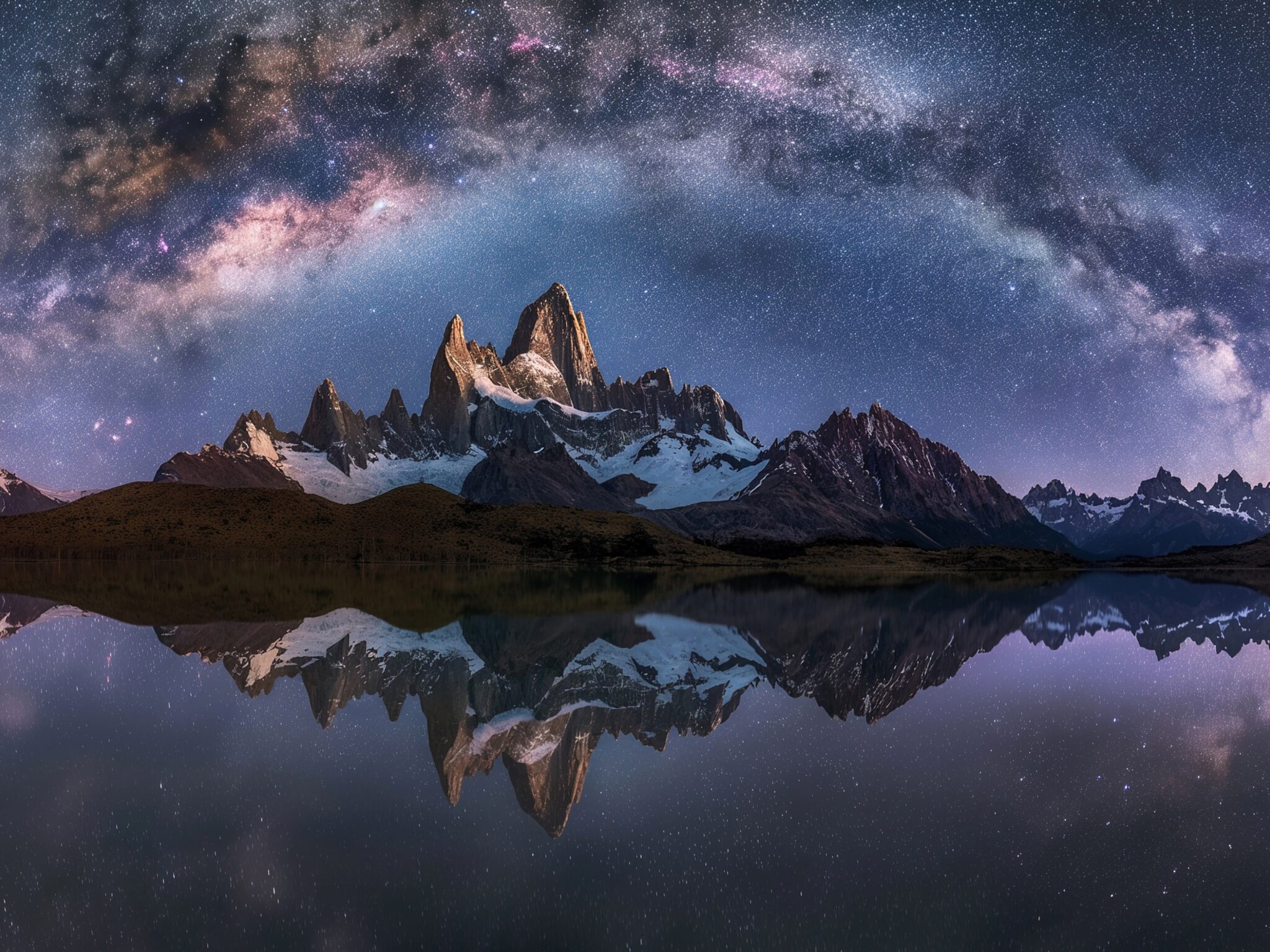 Mountains pierce a star-filled sky where the Milky Way creates a brilliant arch of purple, pink, and blue hues above jagged peaks reflected