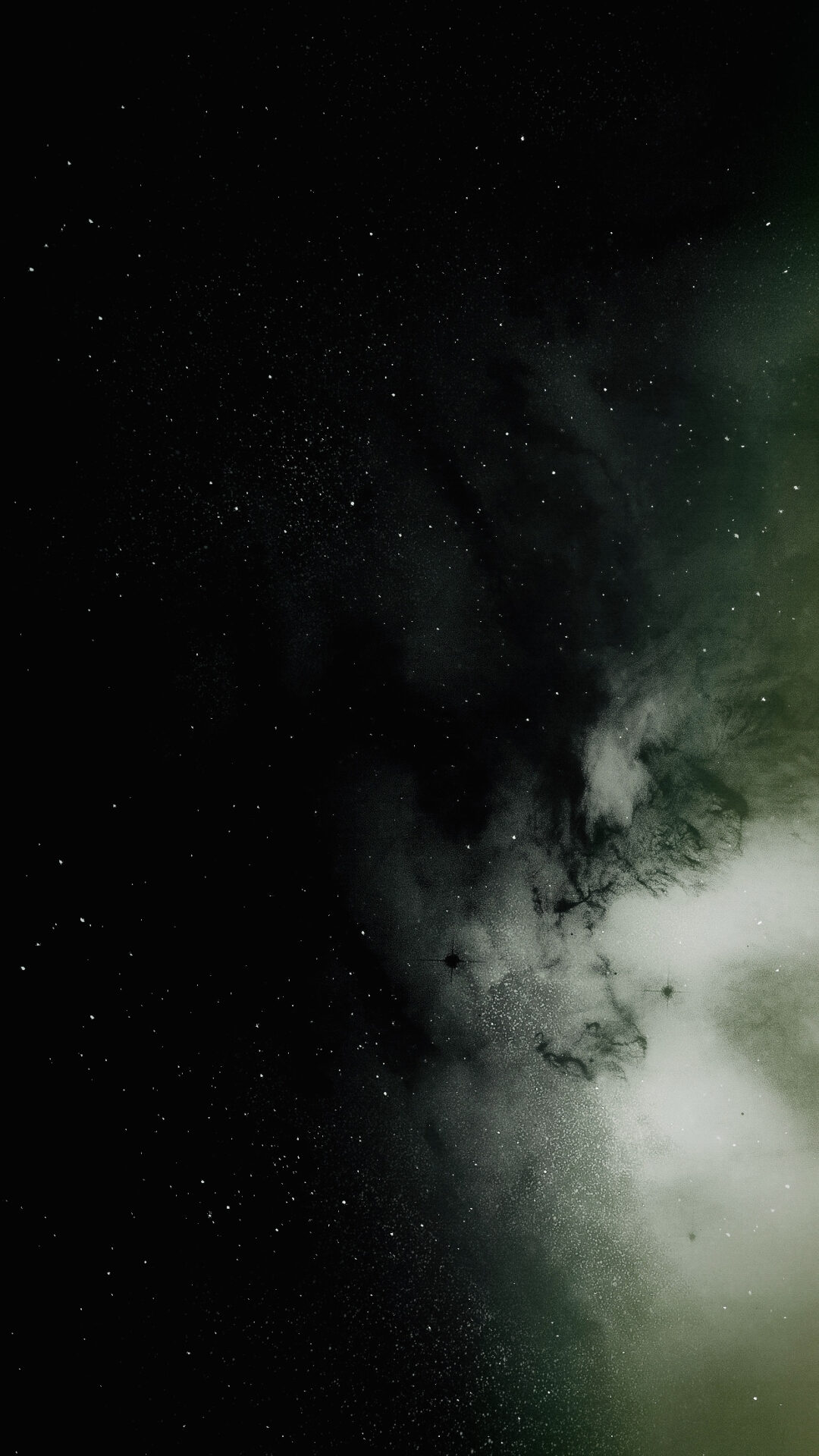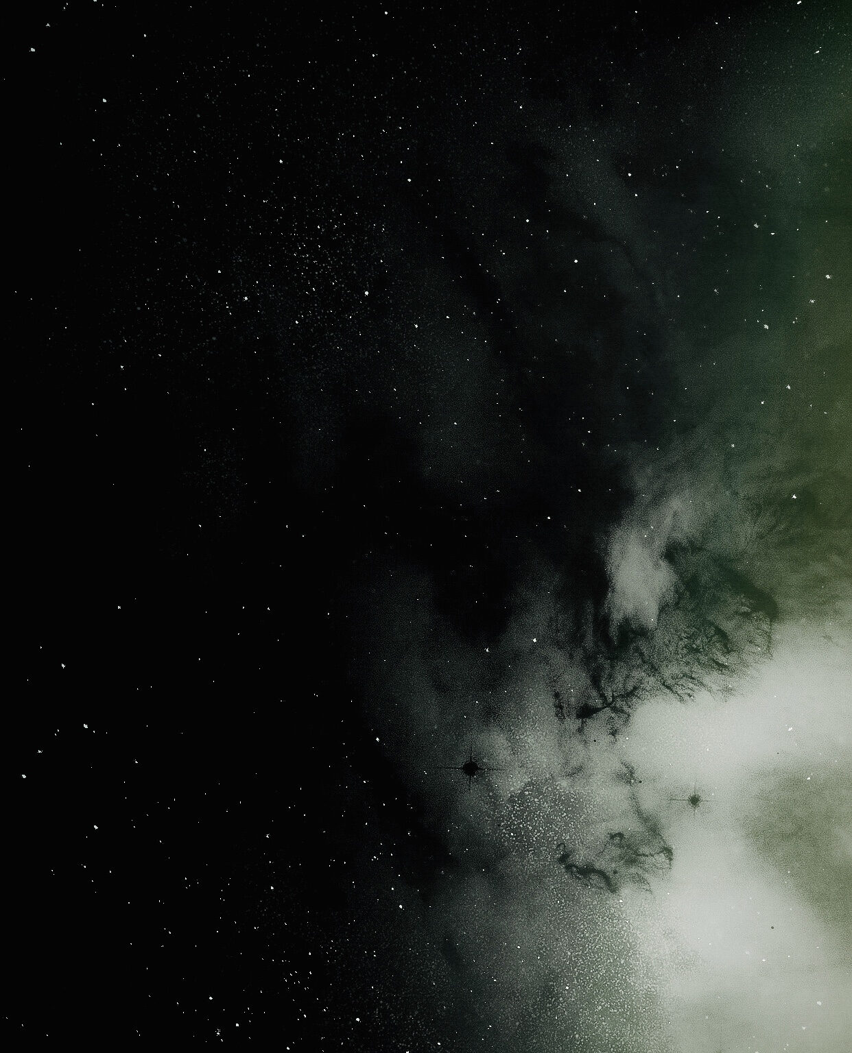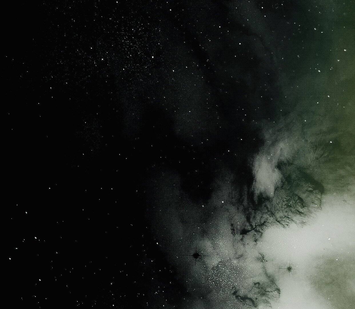 A dark night sky fills the frame, with a dense concentration of stars and a soft, diffuse cloud of the Milky Way. Light greens and whites blend into the deep blacks, creating a sense of vast depth and distance.