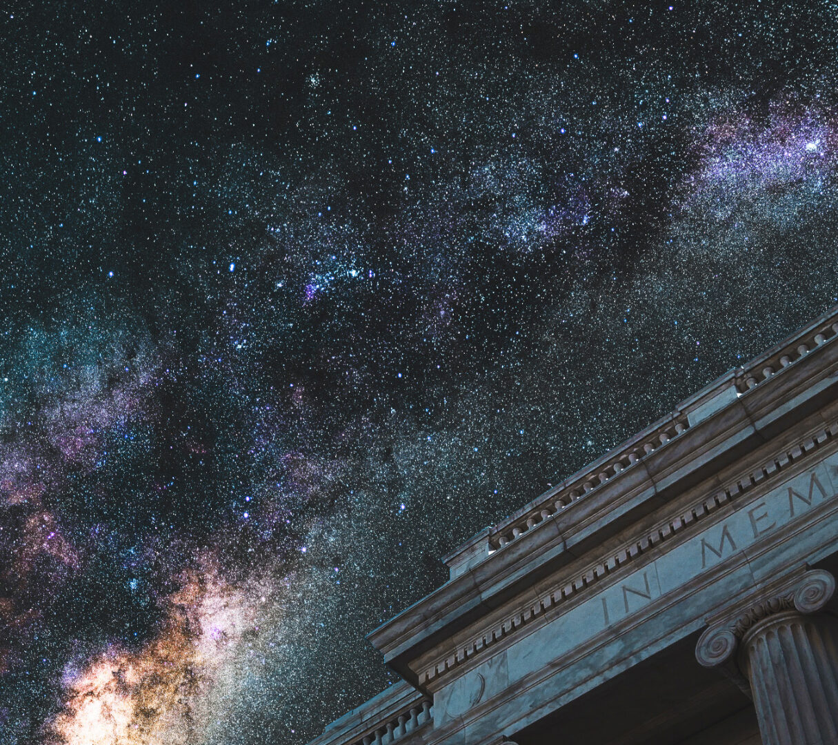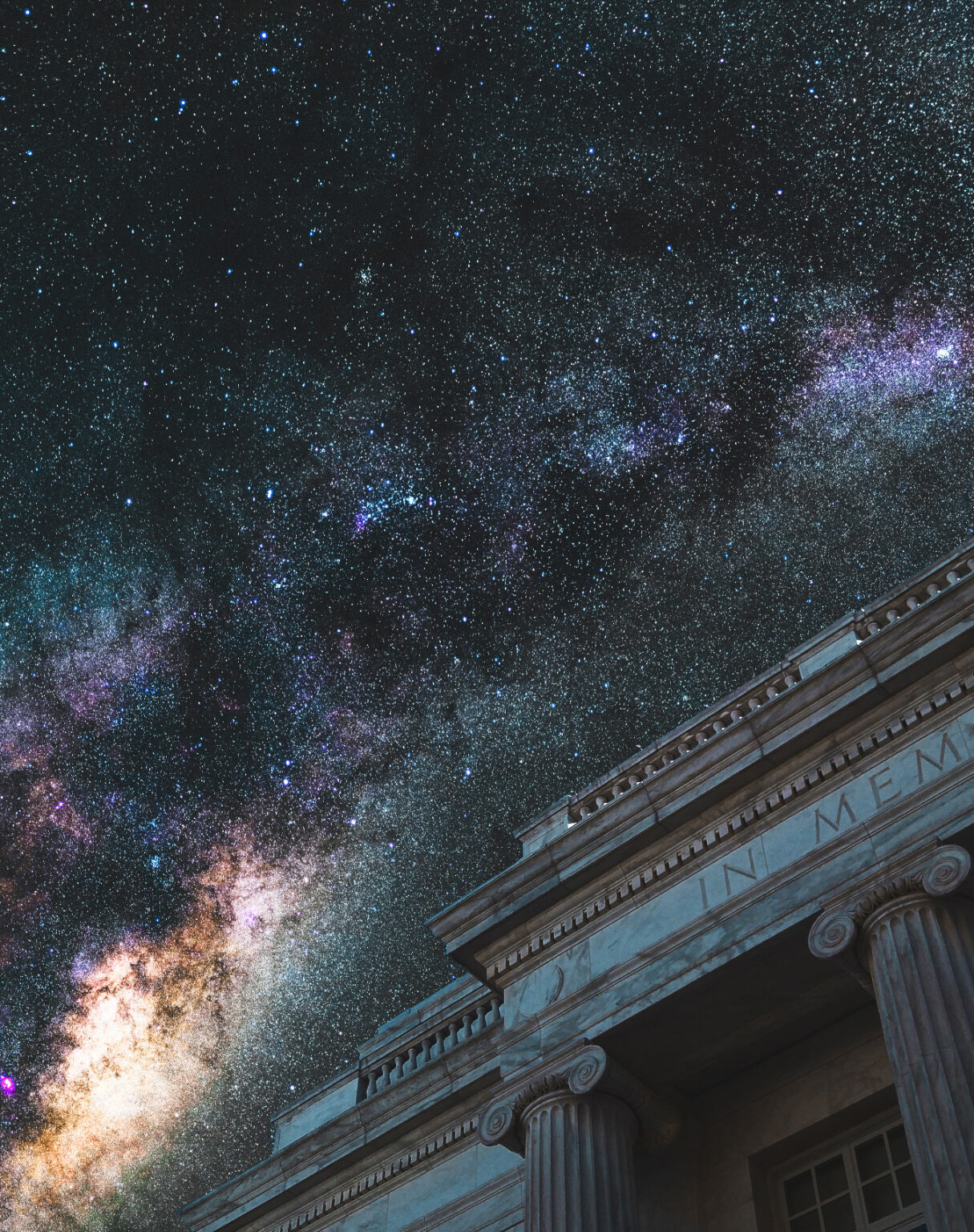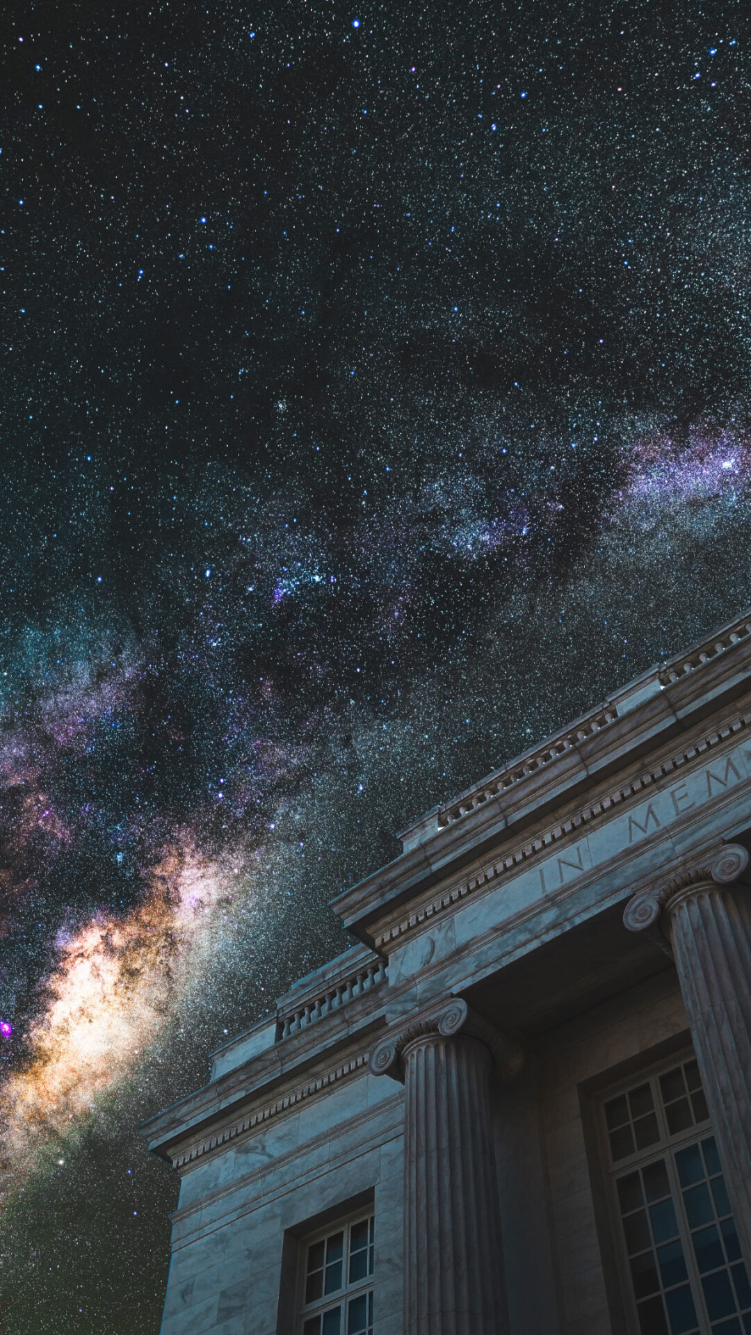 A classical building rises toward a dark night sky filled with stars and the Milky Way galaxy. The stone facade has a subtle texture, contrasted by the deep blues and purples of the galactic band above.