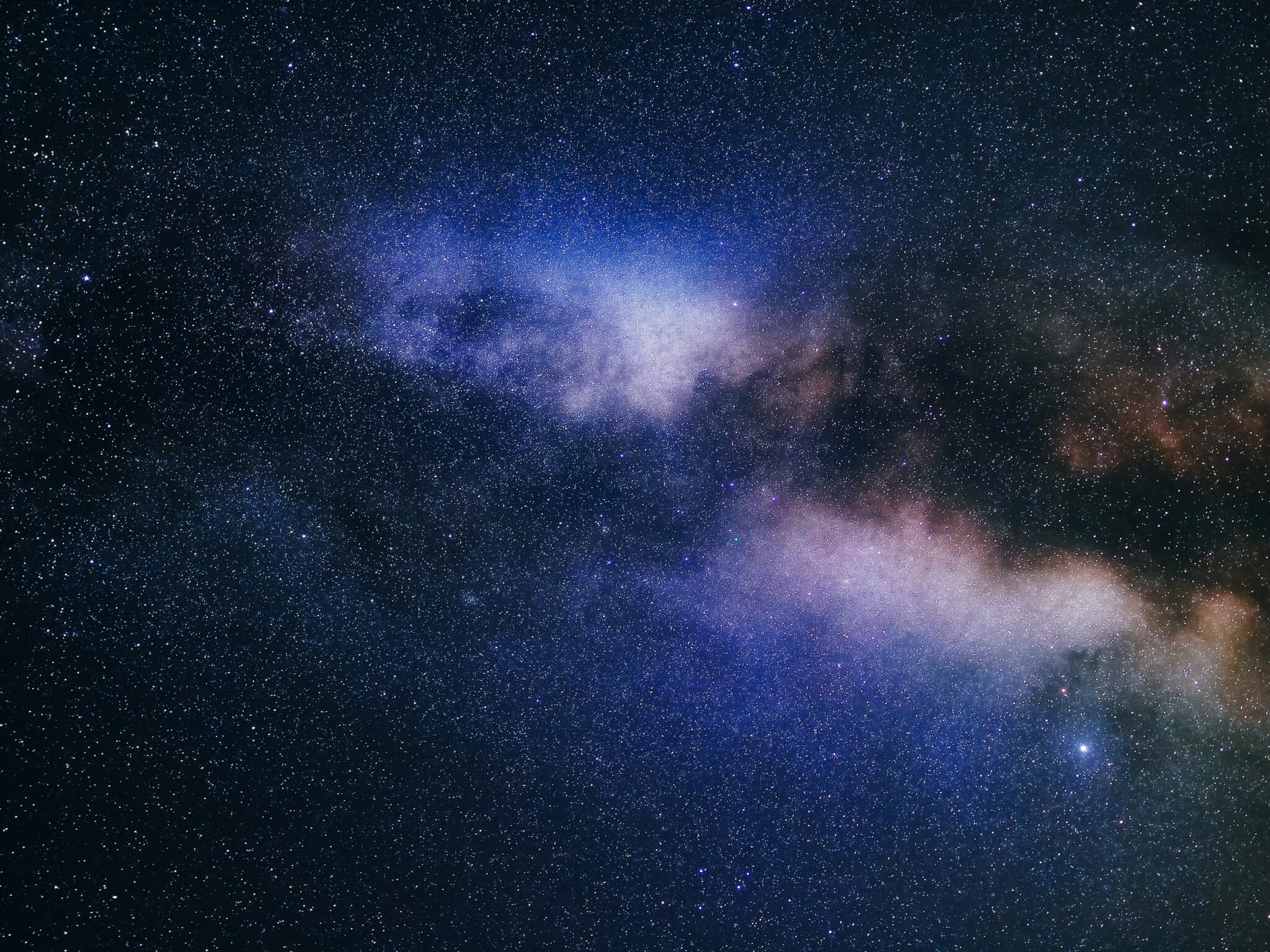 Cosmic clouds in deep purple and blue hues drift through a star-filled night sky, creating an otherworldly galaxy scene. This space wallpaper works well for 4K desktop backgrounds when you want something mystical and celestial.