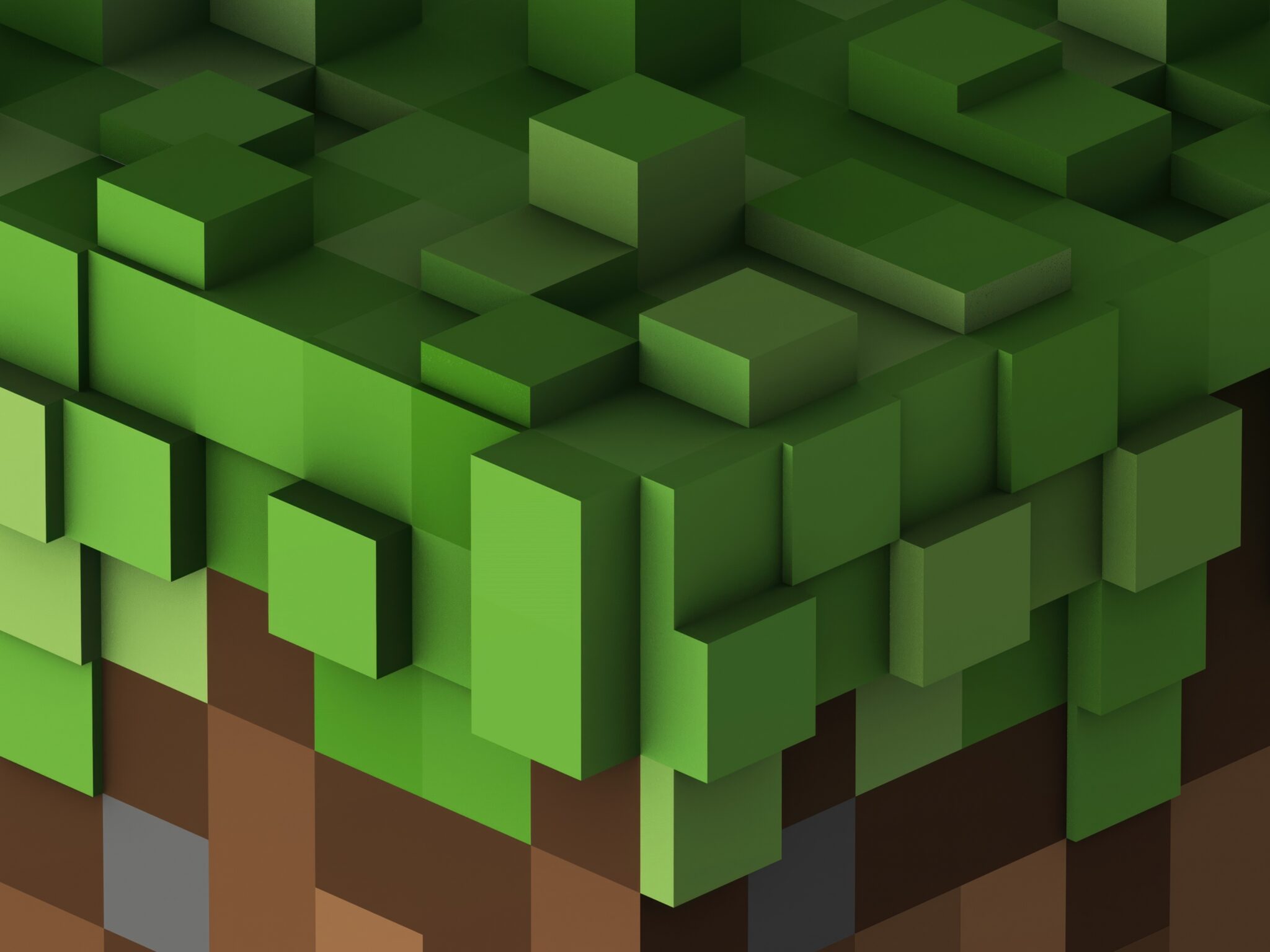 Minecraft grass blocks rendered in a cool 3D style with layers of bright lime green and forest green cubes sitting on dark brown dirt blocks. For 4K monitors, this abstract gaming wallpaper brings that blocky aesthetic to your desktop.