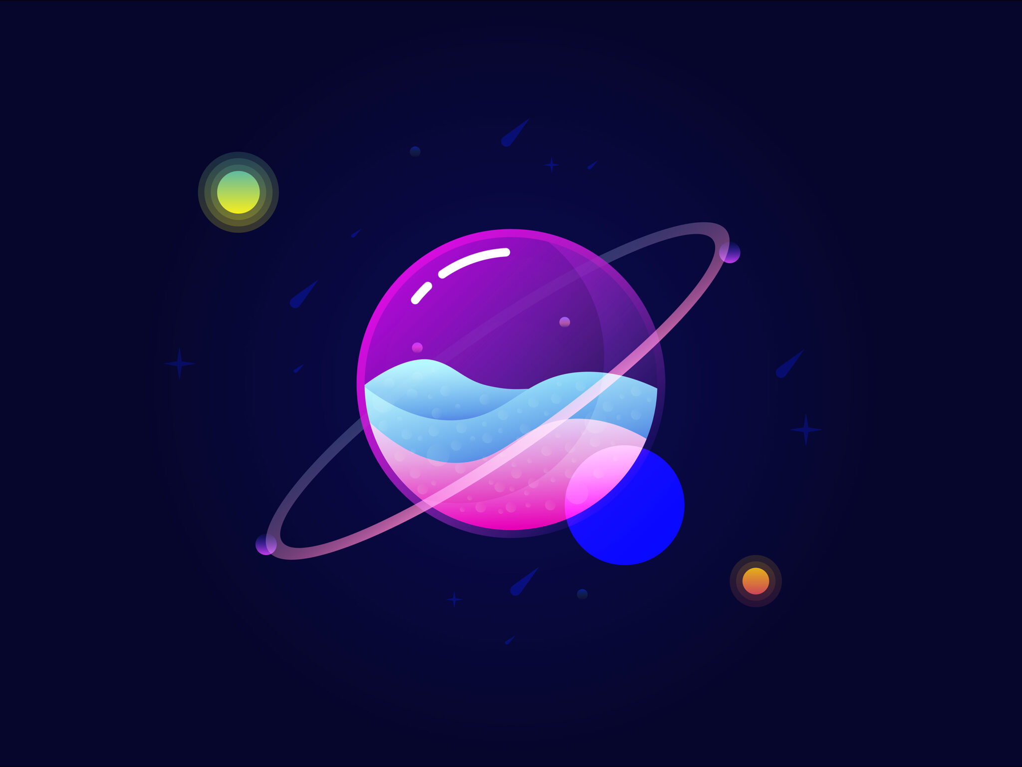 Vibrant planets in purple, pink, and blue hues float through deep space alongside a glowing yellow-green star against a dark navy backdrop. This colorful minimal space illustration works well for desktop wallpapers and wide screen displays.