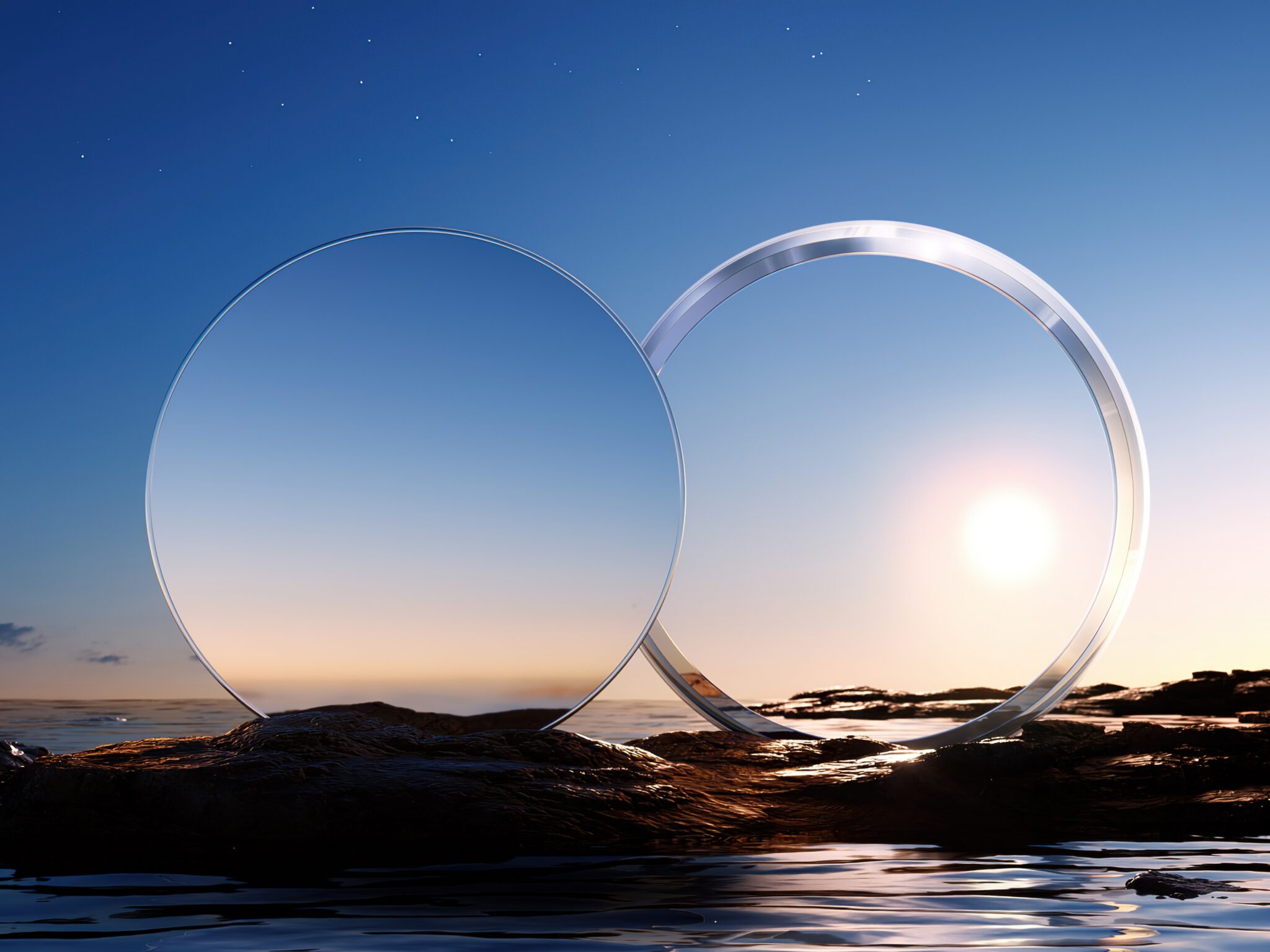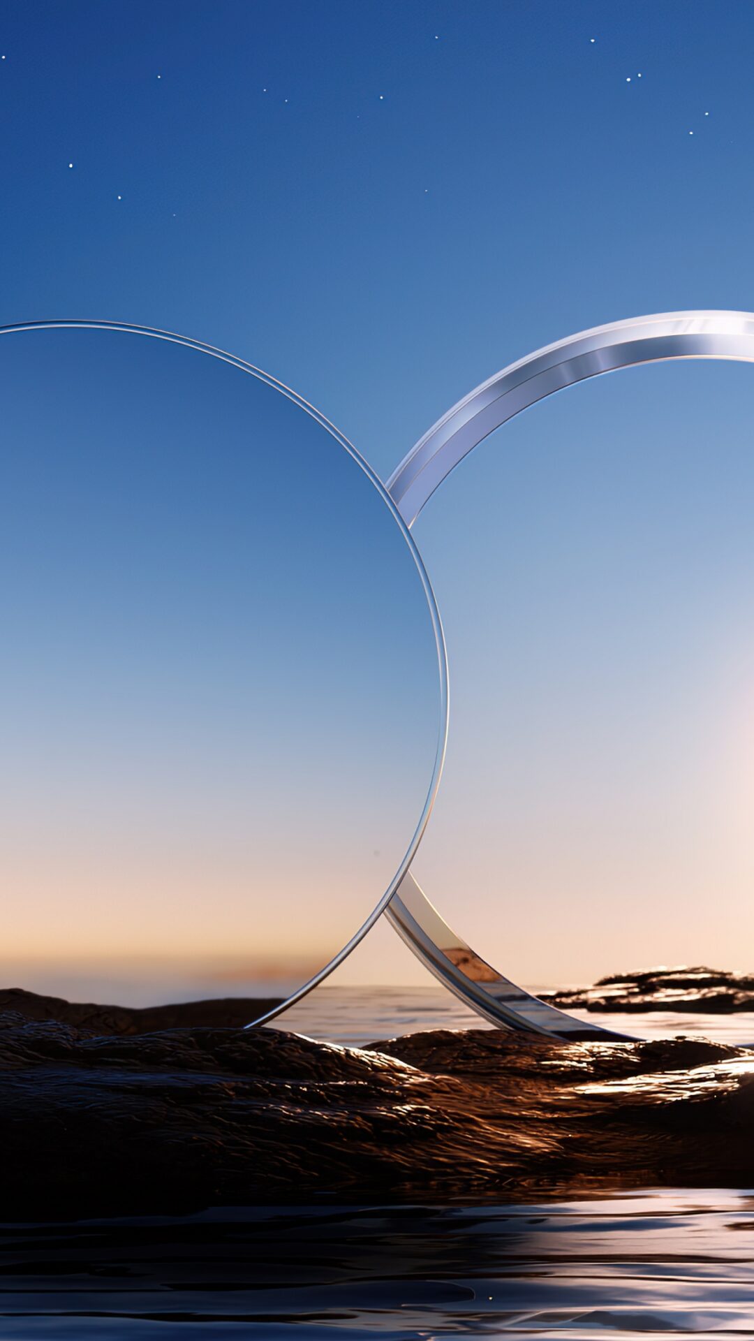 Two transparent circular mirrors frame a golden sunset over dark rocky coastline, reflecting warm orange and pink hues against the deep blue twilight sky. This dreamy digital composition works beautifully for 4K desktop wallpapers.