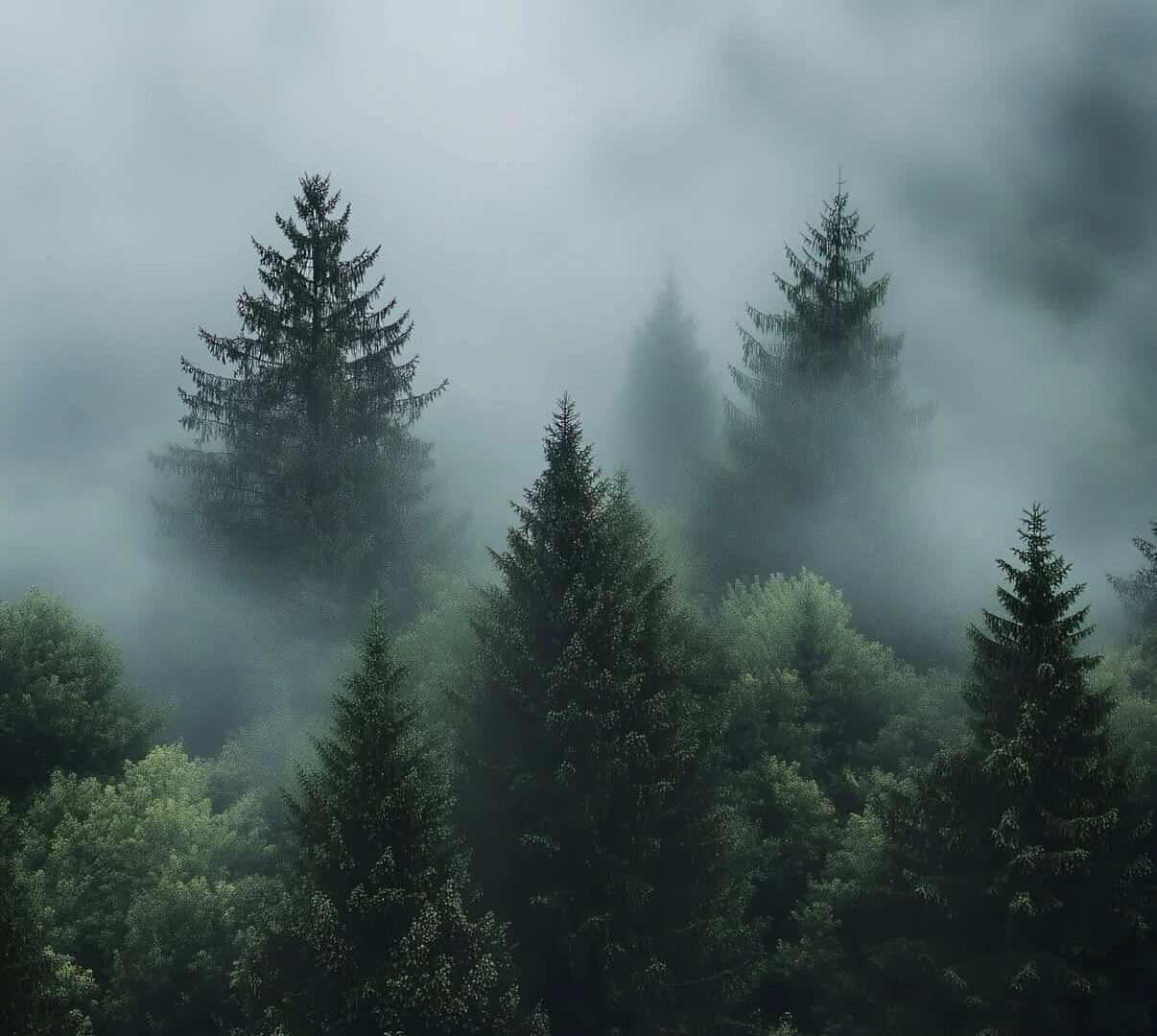 Dense evergreen trees fill the frame, receding into a fog-covered hillside. The soft, cool light creates a muted palette of greens and grays