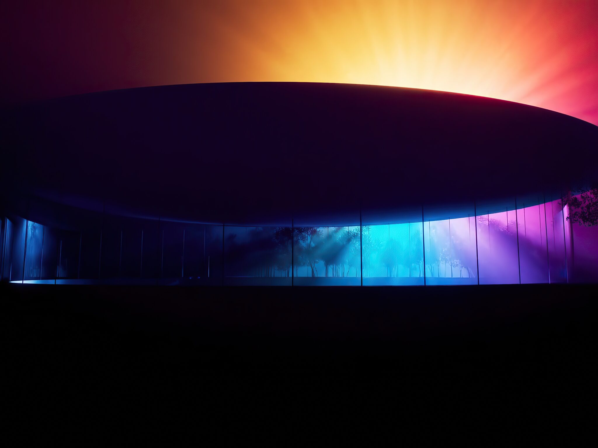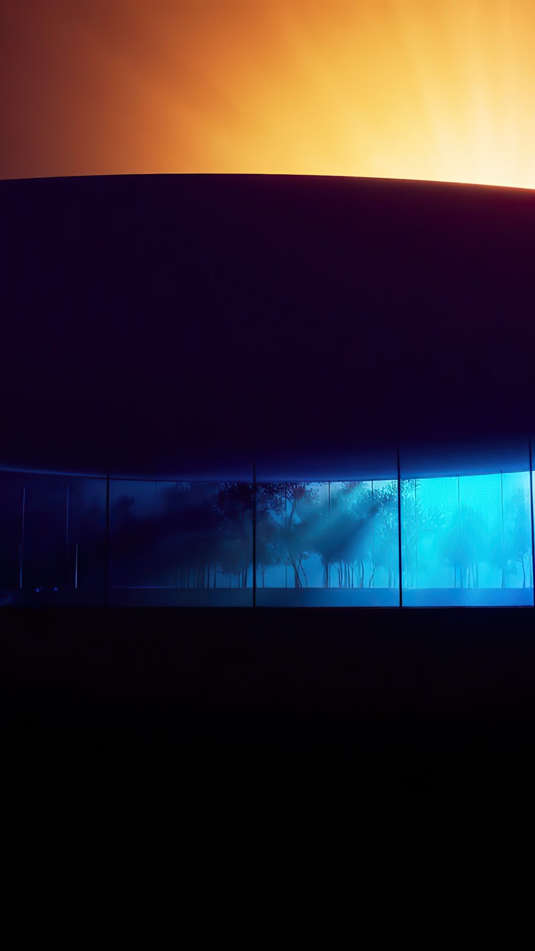 A large, circular building is centered against a dark foreground. Light from a sunset or artificial sources casts a warm orange and cool blu