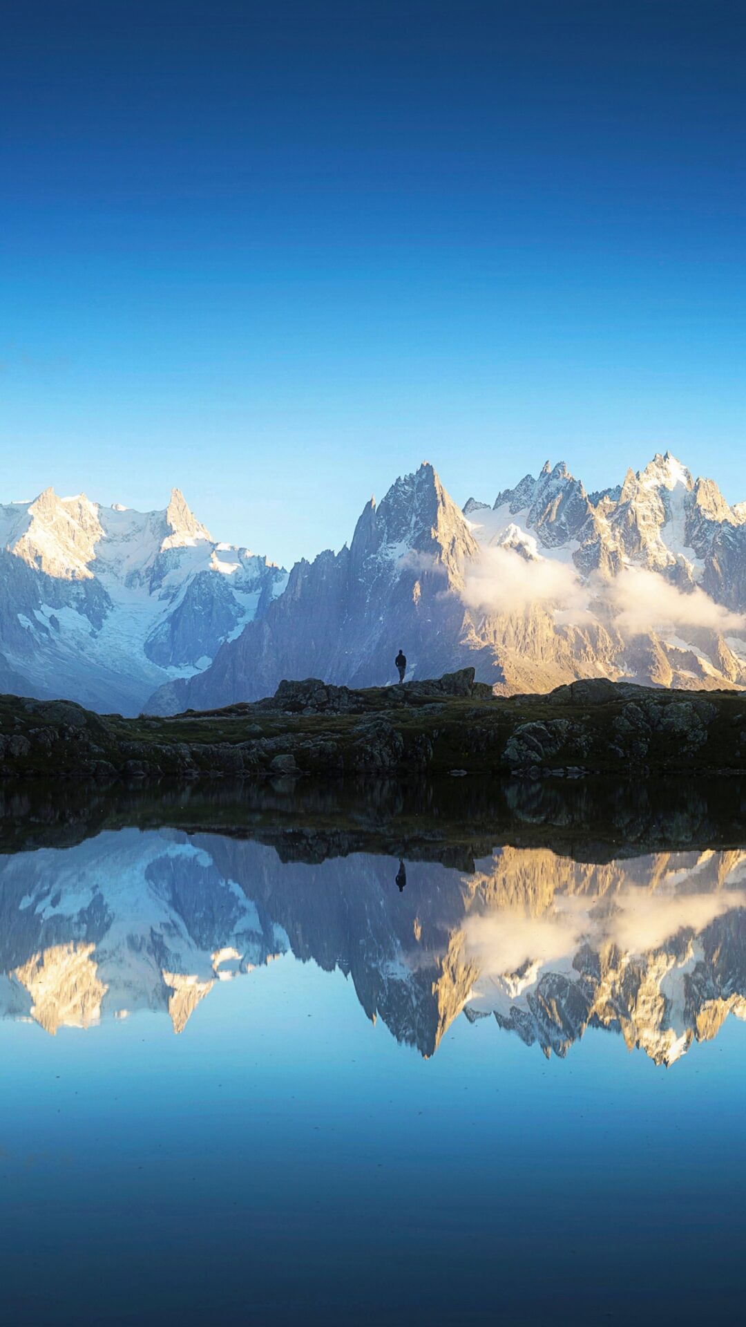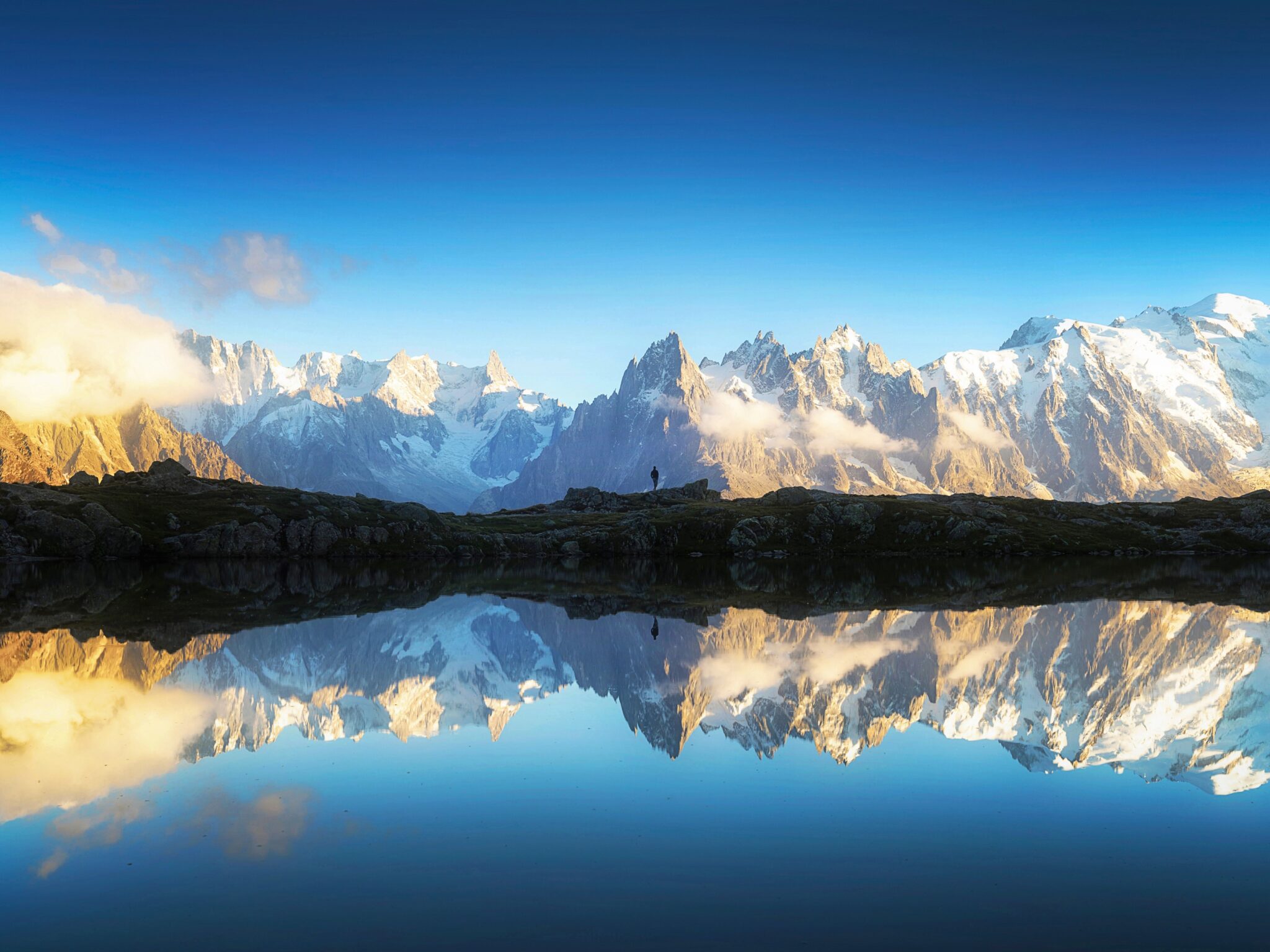 Snow-capped Mont Blanc peaks glow golden against deep blue skies while creating mirror-perfect reflections in the calm alpine lake below. This crisp mountain landscape works beautifully for ultrawide monitors and desktop backgrounds.