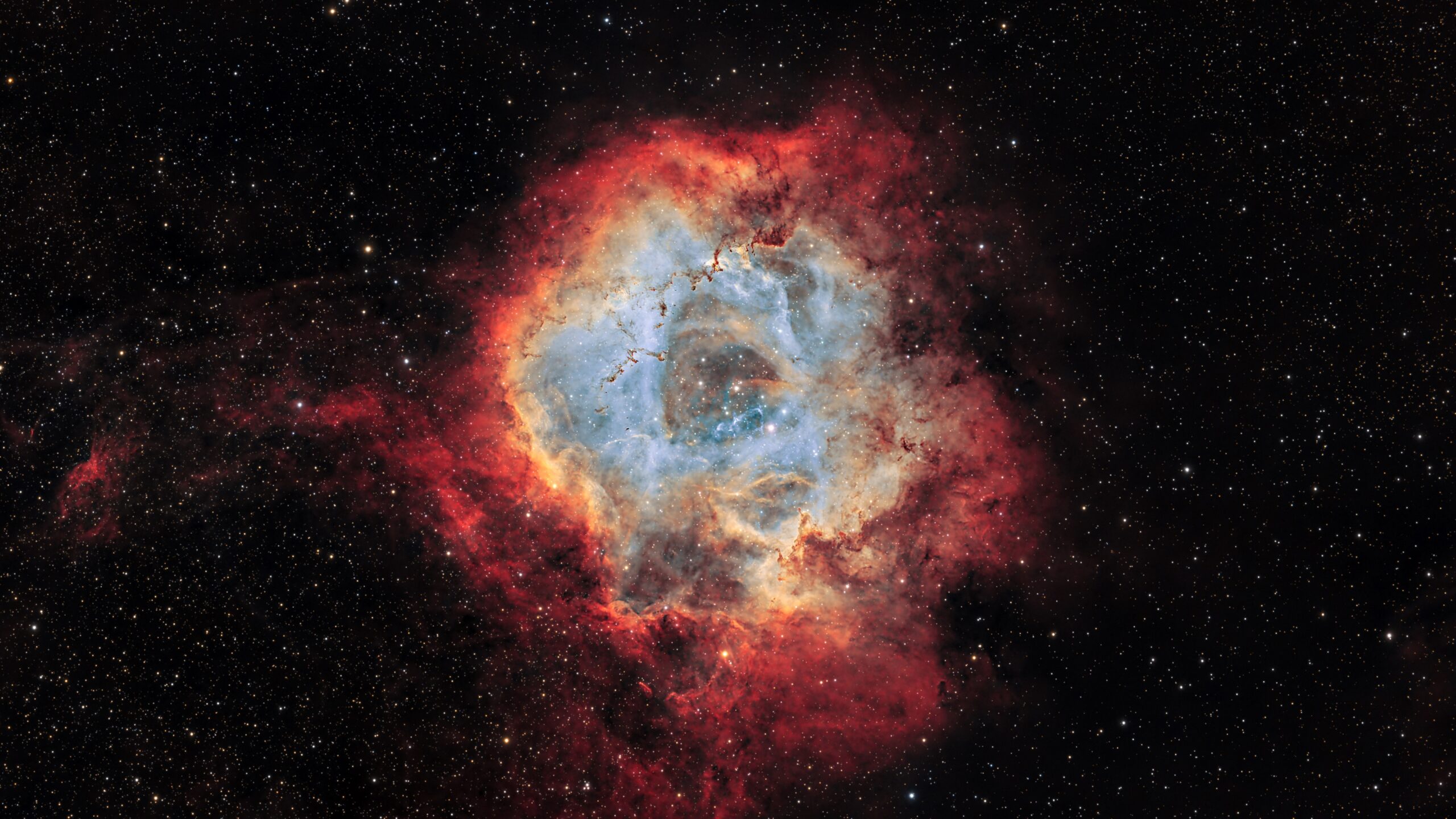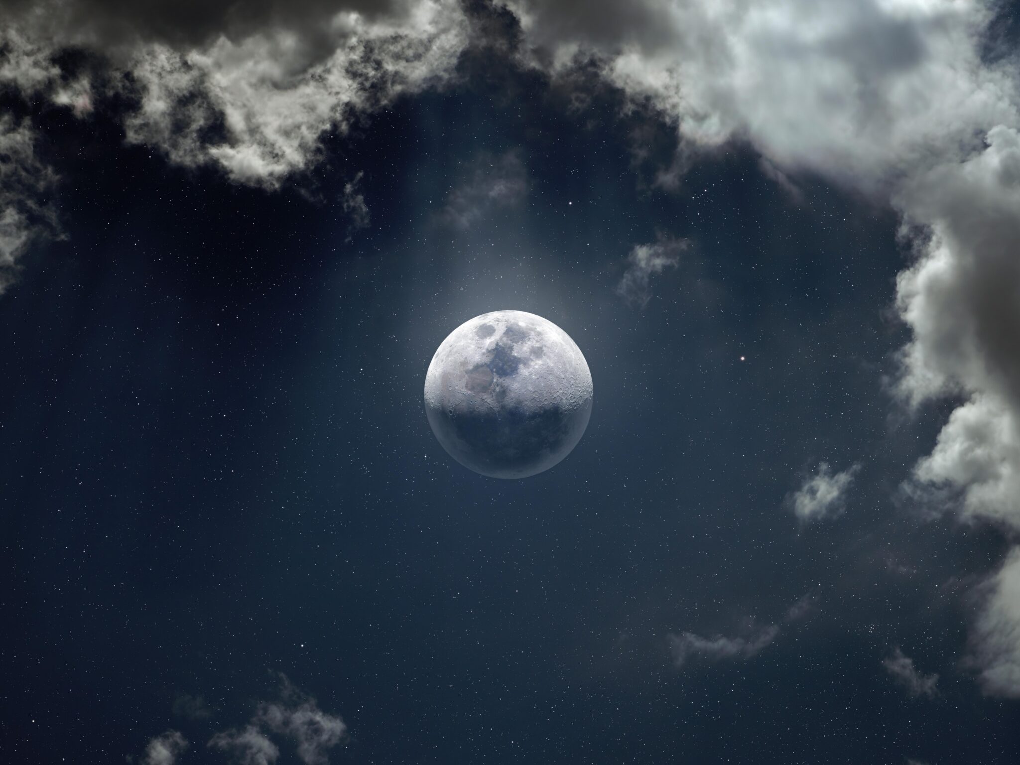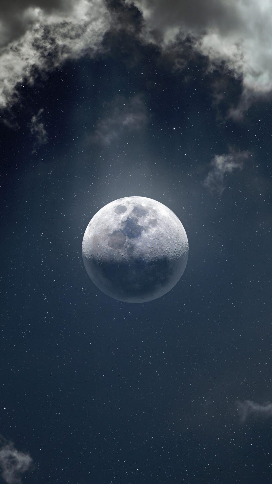 Dramatic gray and white clouds frame a bright full moon against a deep blue starry sky. Works well for desktop wallpapers on widescreen moni…