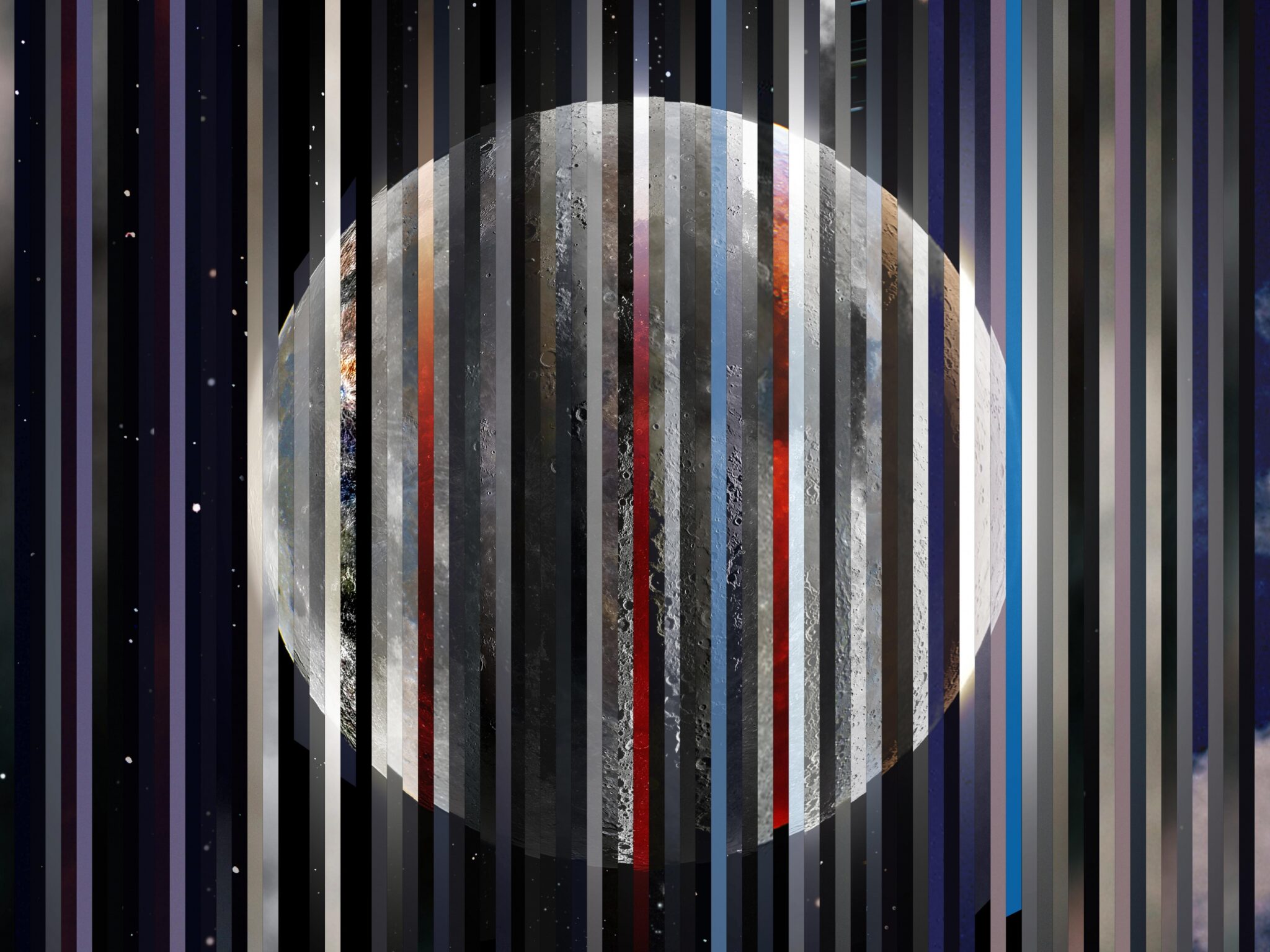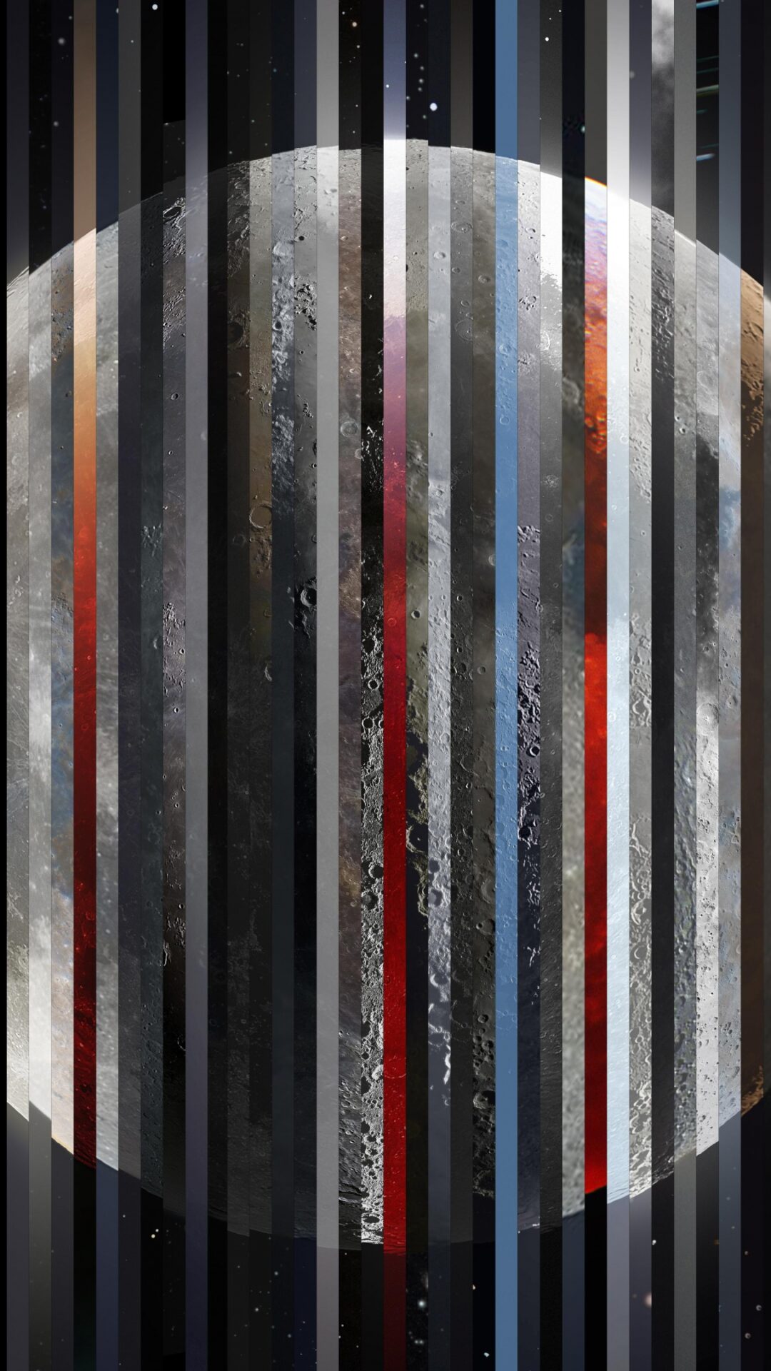 Vertical stripes in blues, grays, and reds create a layered effect over a bright full moon against a starry night sky. Made for vertical pho