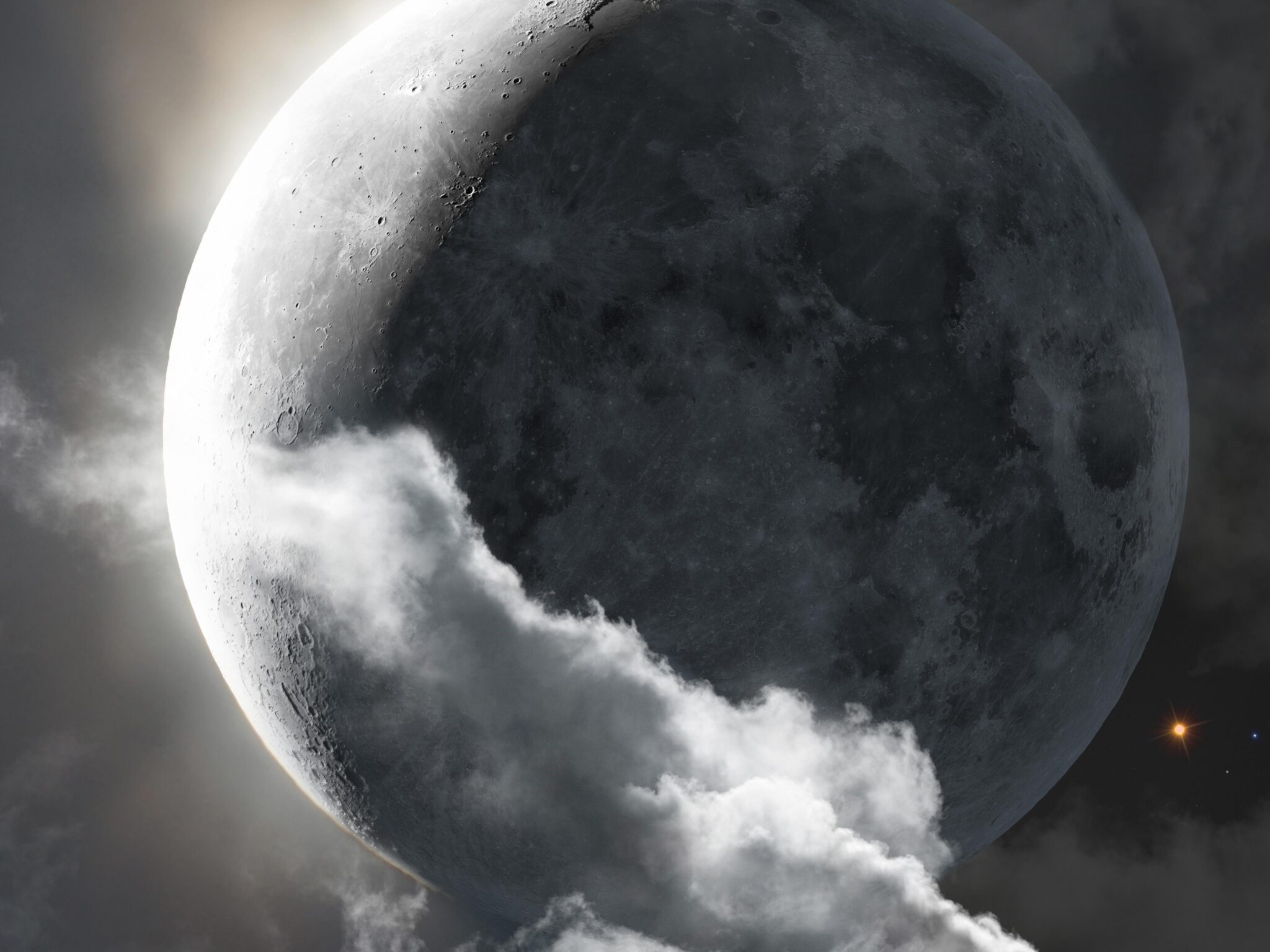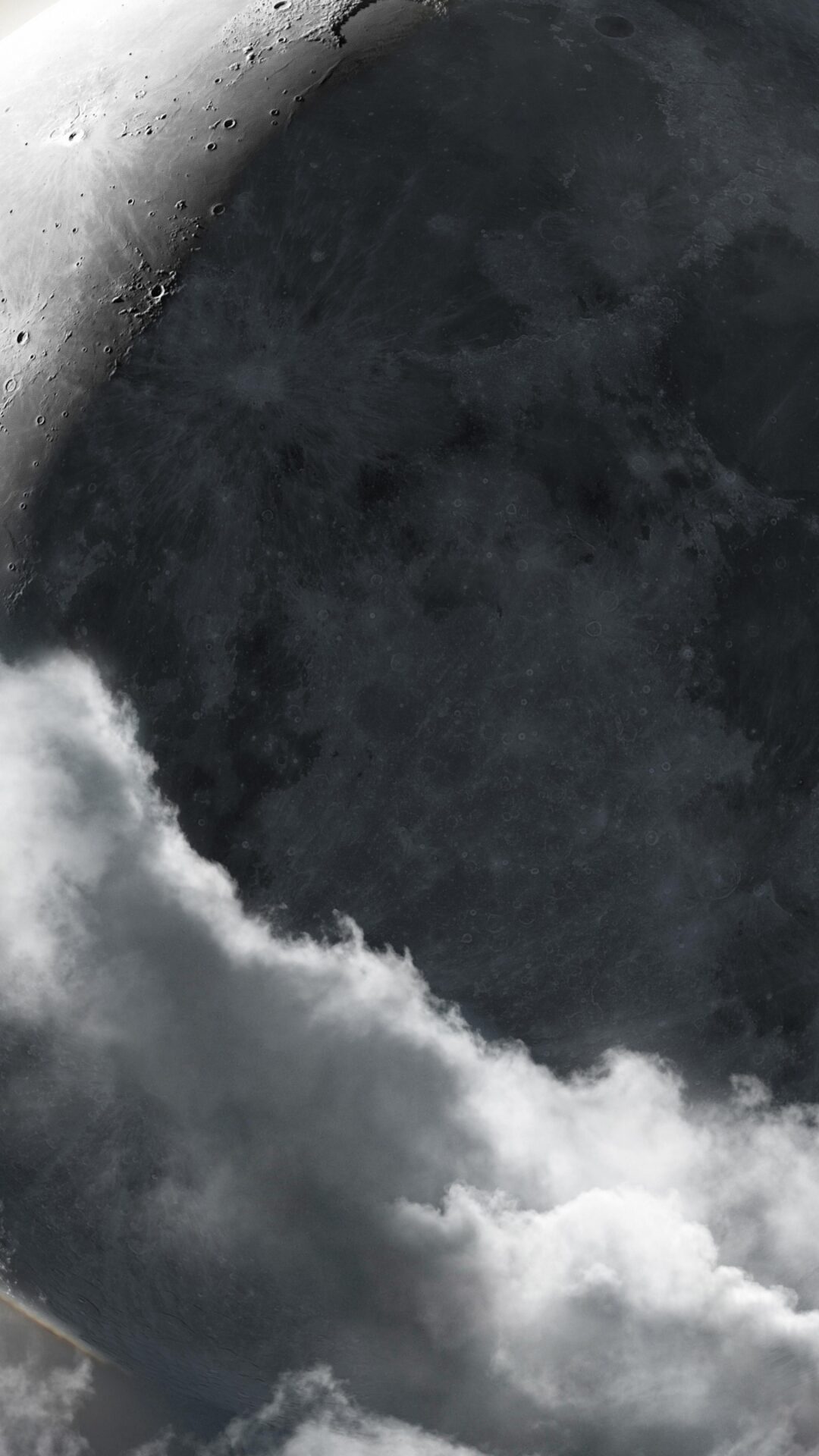 Dramatic clouds drift across a luminous moon showing detailed craters and maria in silvery-white against the dark space backdrop. This celes…