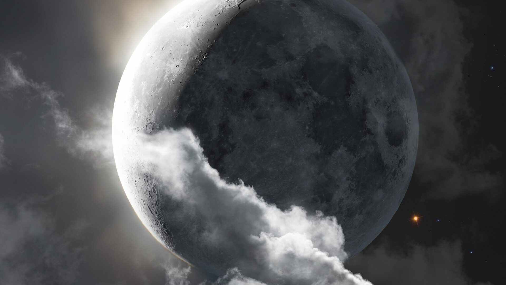 A large moon dominates the frame, partially obscured by white clouds. The gray surface is heavily cratered, contrasting with the bright sunl…