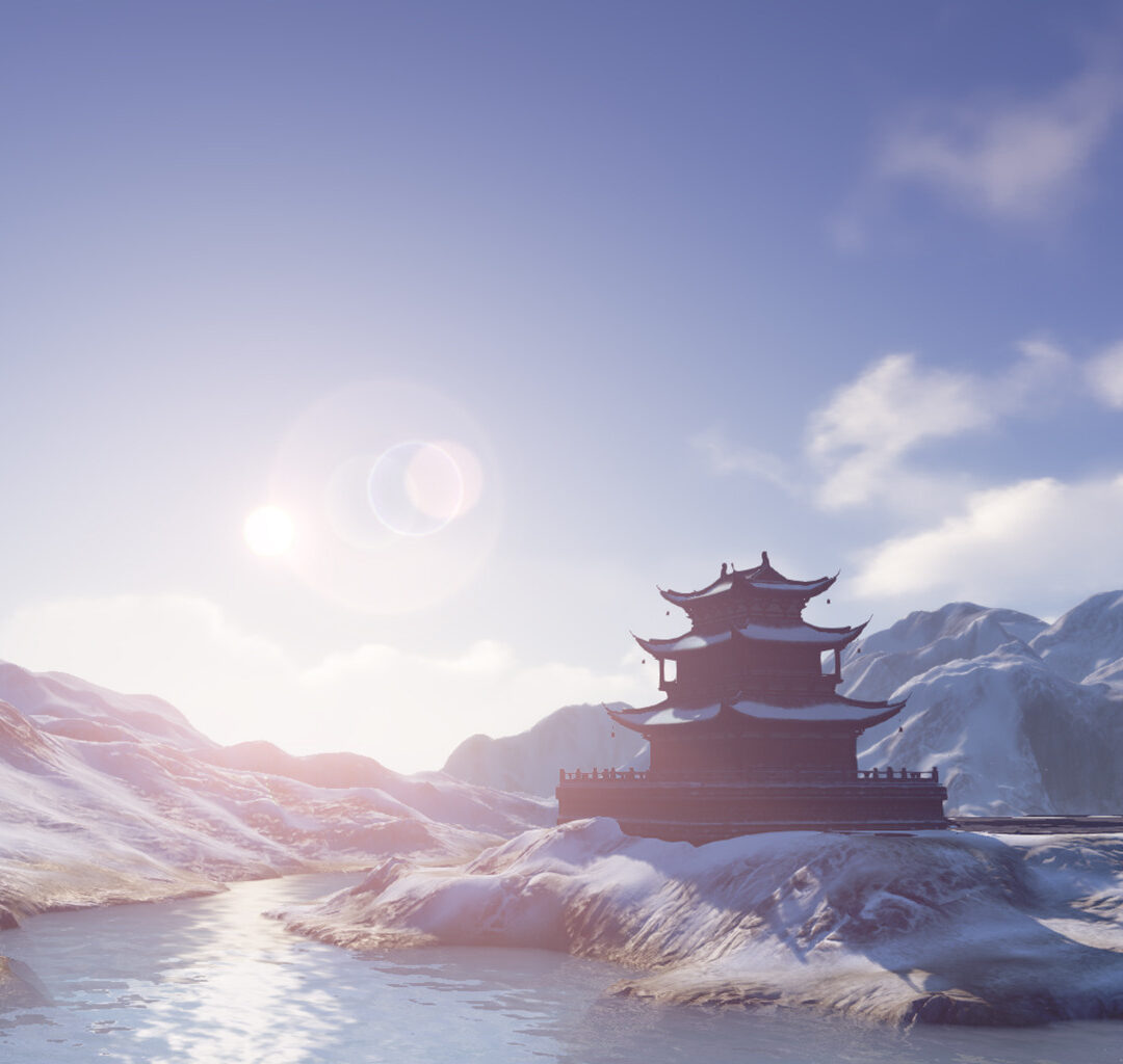 Moonlight Blade Snowy Pagoda River Valley Desktop Wallpaper 4K