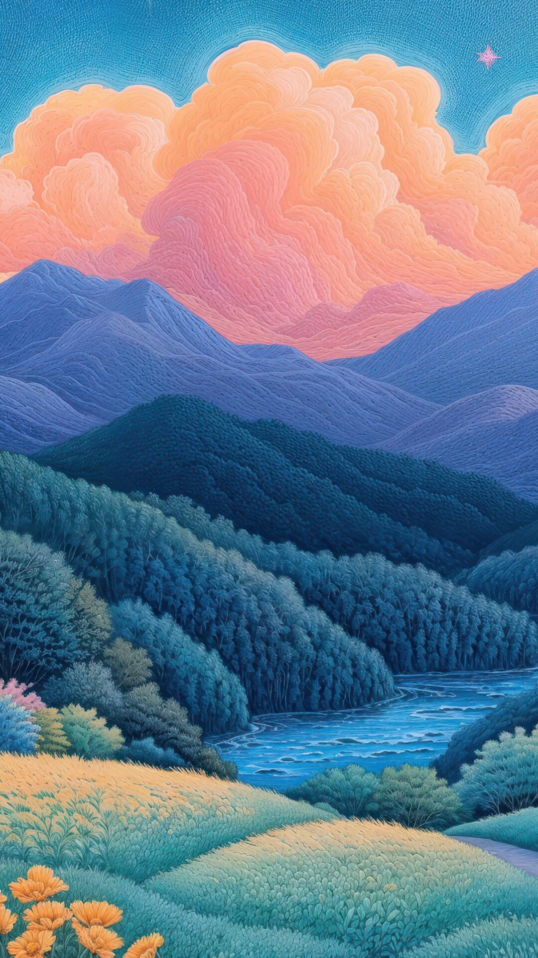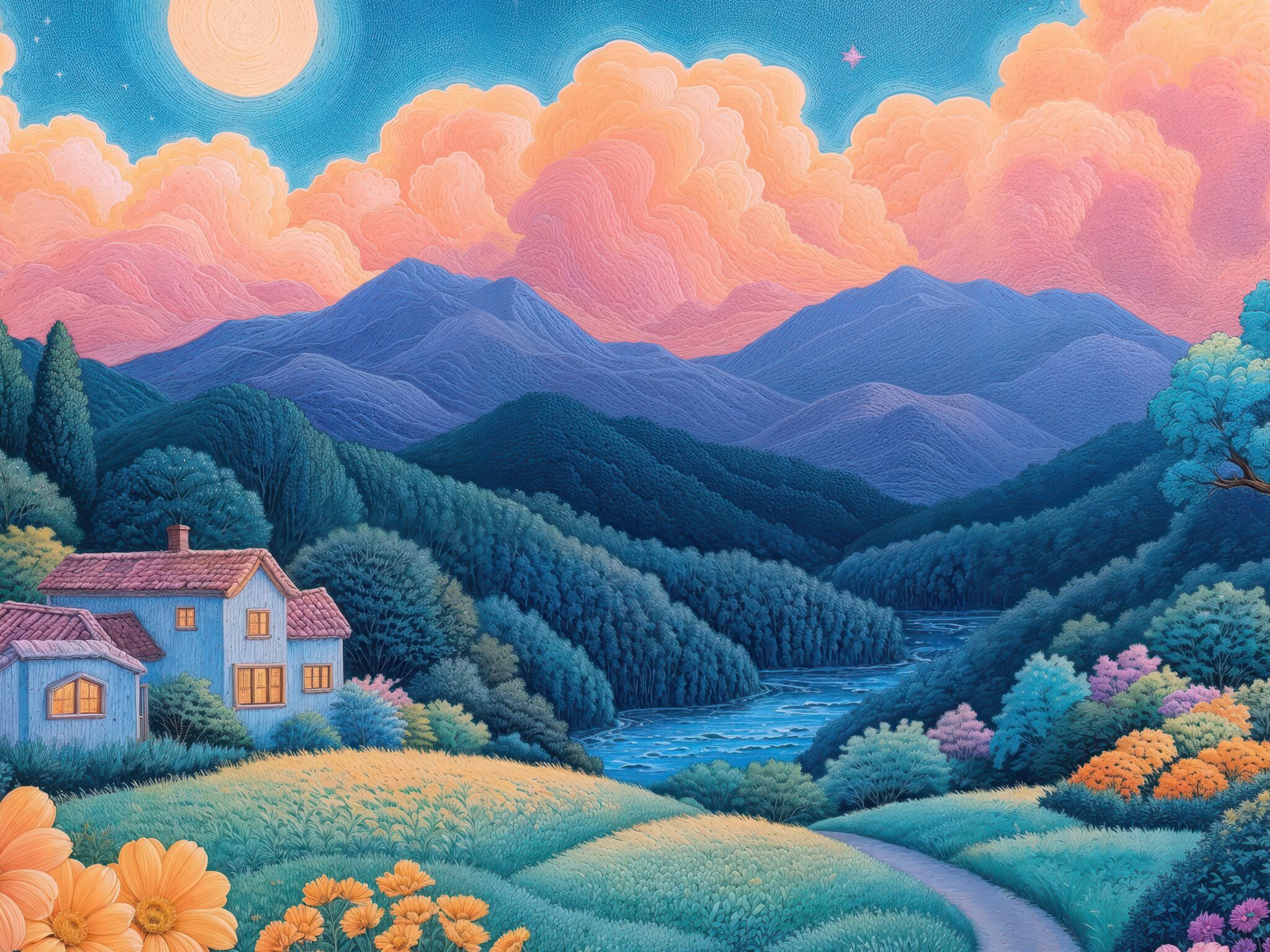 Rolling green hills dotted with vibrant orange and pink wildflowers fill the foreground, while a cozy house with glowing windows nestles amo