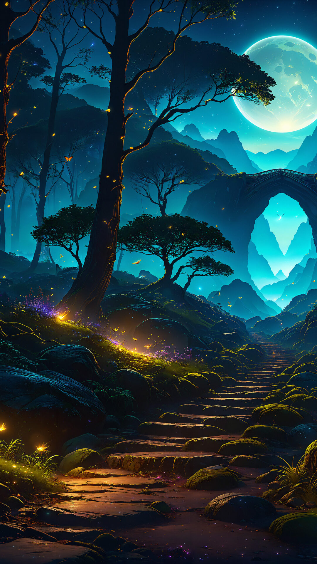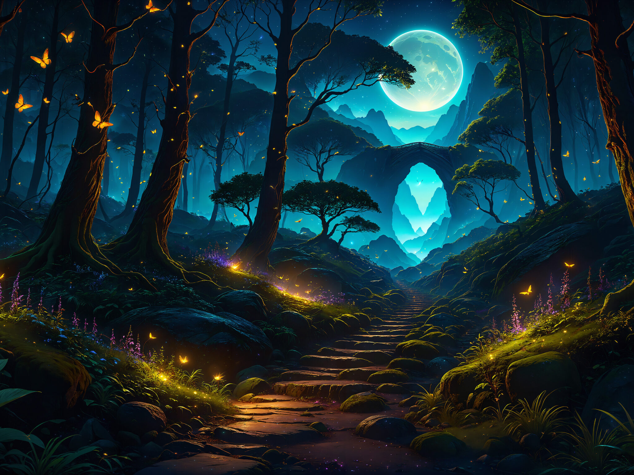 Glowing orange and blue butterflies flutter through a mystical forest path under a bright full moon, with ethereal blue light emanating from