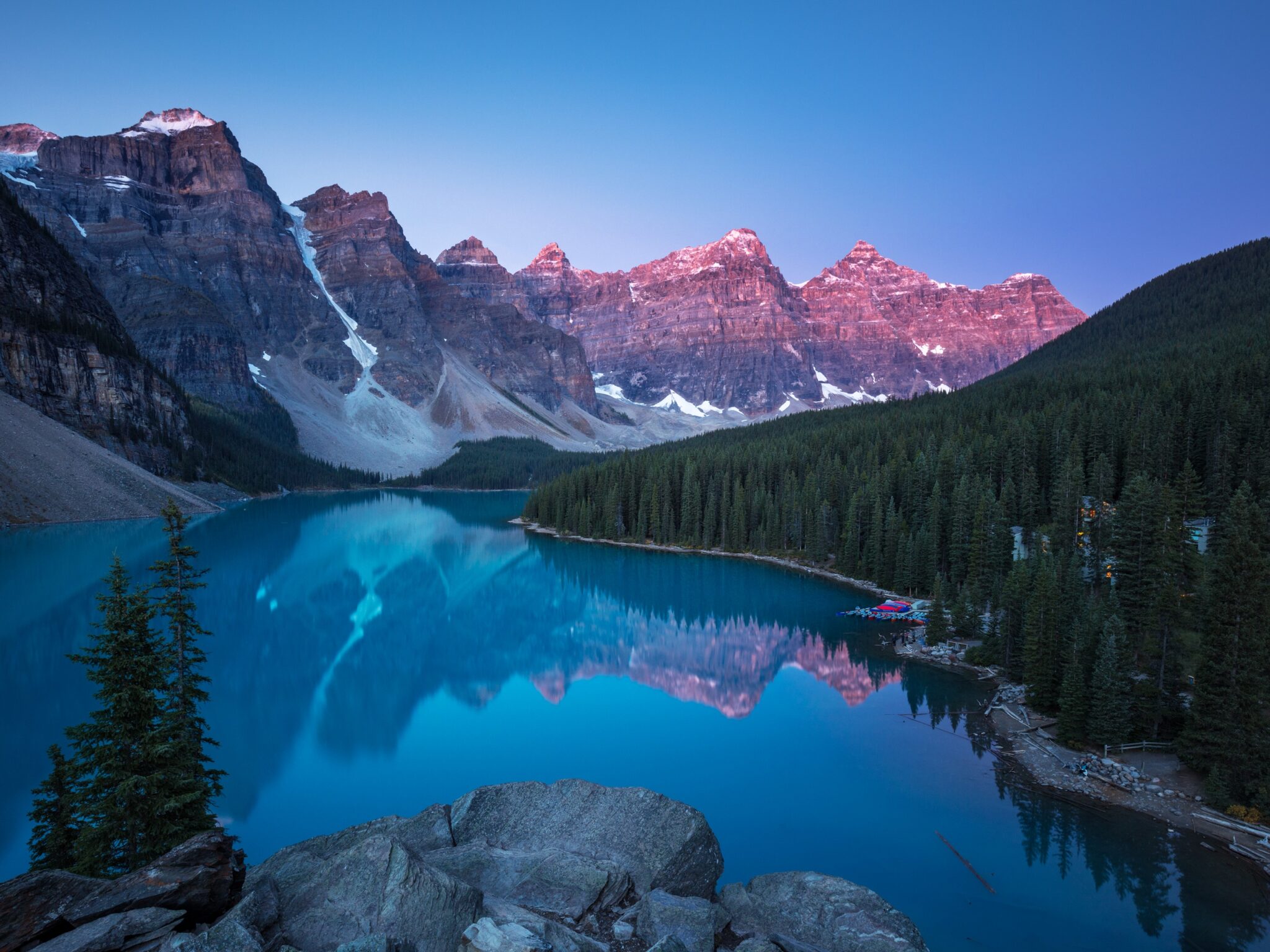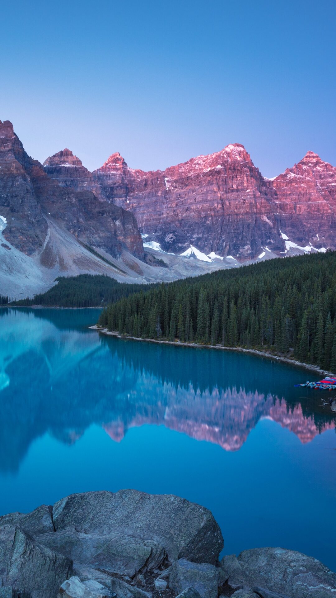Moraine Lake's turquoise waters mirror the pink alpenglow on towering mountain peaks while evergreen forests frame this iconic Canadian Rockies scene. This high-resolution wallpaper works beautifully for desktop monitors and wide-screen displays.