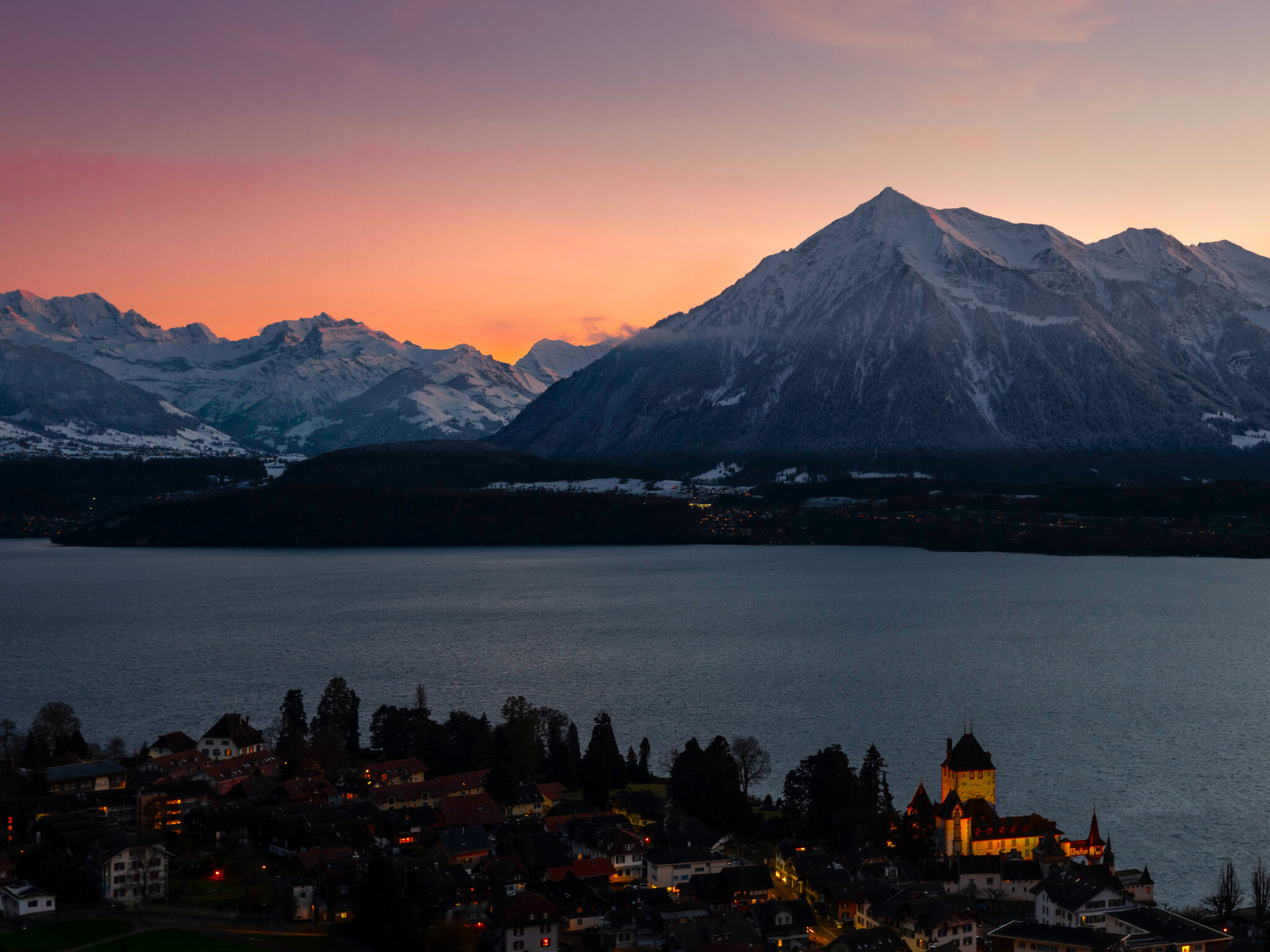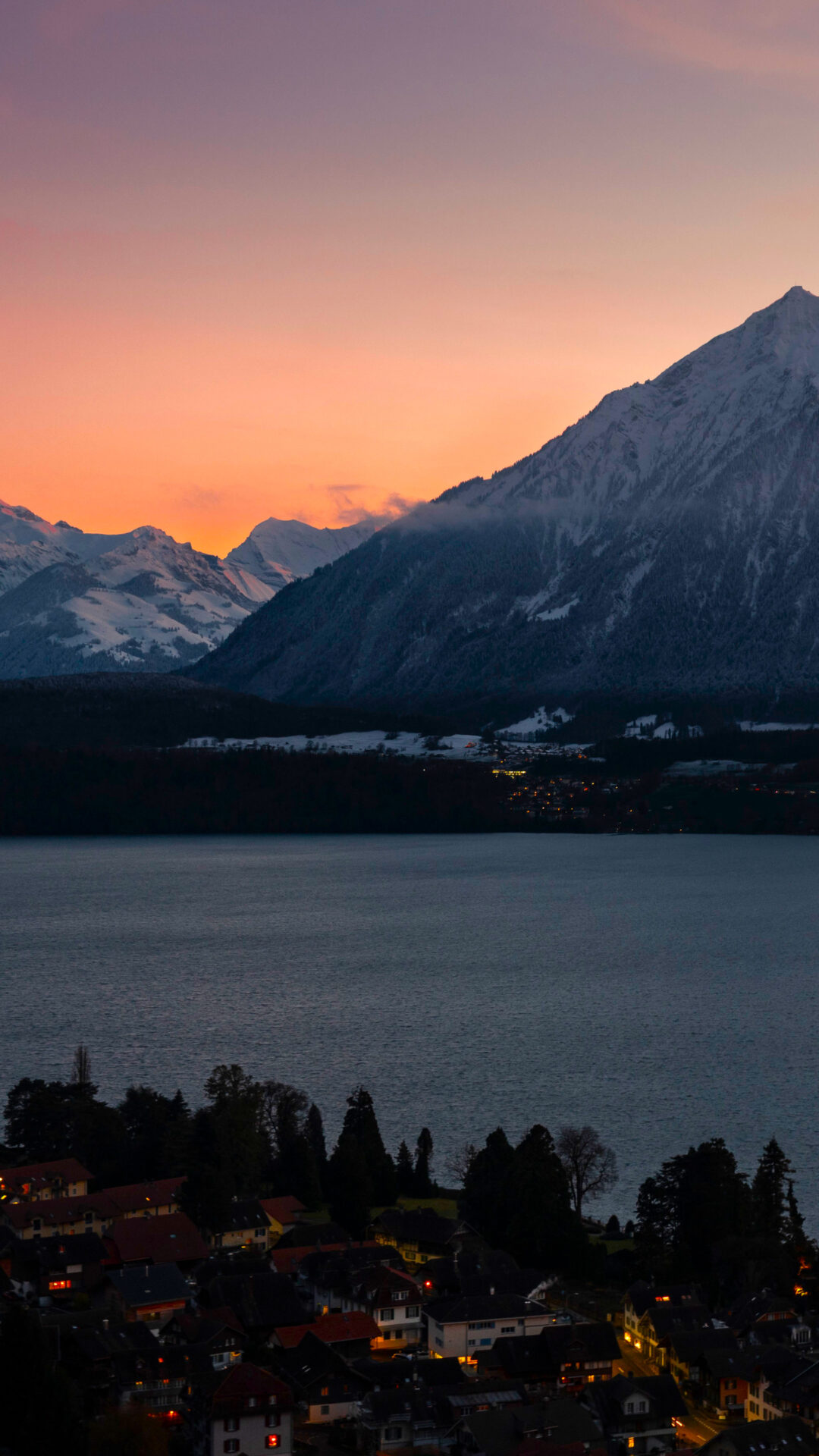 A town sits along a large body of water, facing a snow-covered mountain range at dusk. The sky blends shades of orange and pink, casting a m…