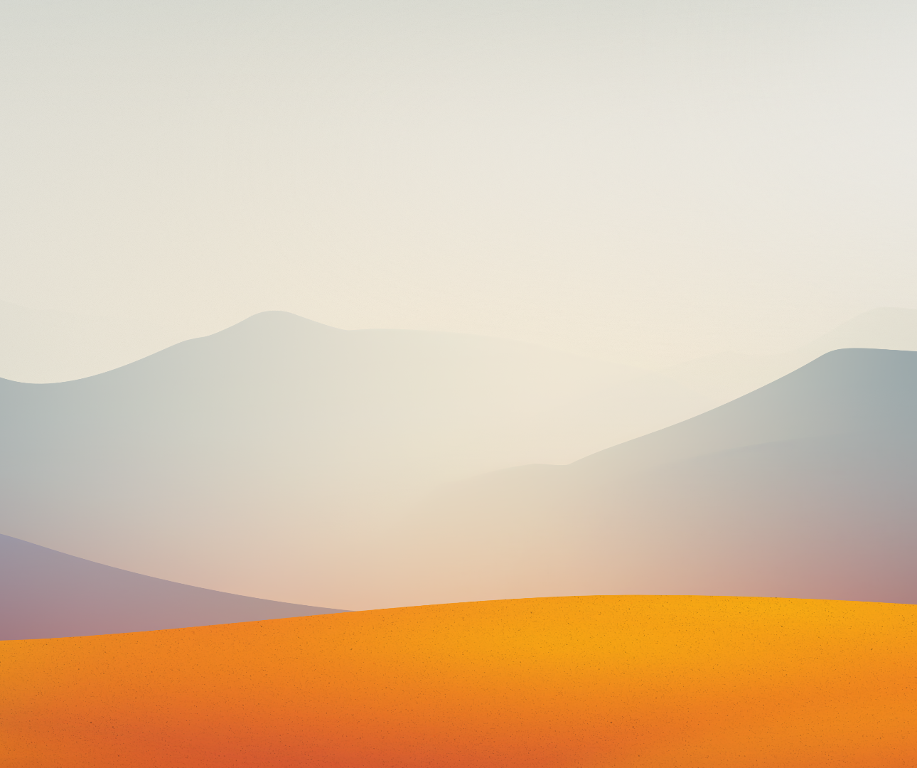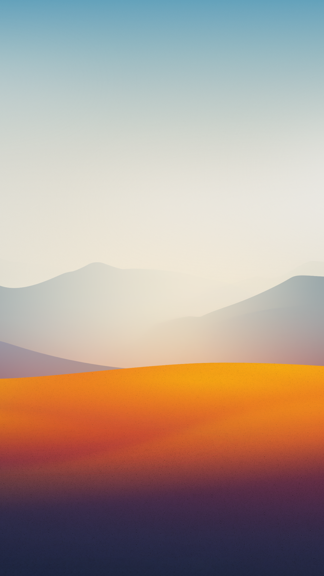 Layers of hazy mountains fill the lower half of the frame beneath a clear blue sky. Soft gradients of orange, red, and dark blue create a smooth transition from bottom to top.